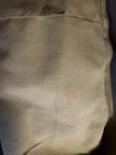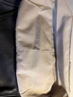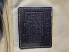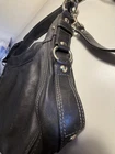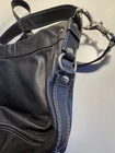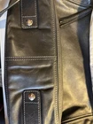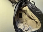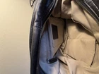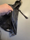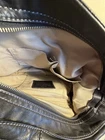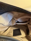 Black soft leather l, tan/beige fabric liner, zipper closure, silver tone hardware. Interior zip pocket and split pocket. Two straps so bag can be converted- over the shoulder or cross body. Liner has some marks, see photos. Exterior has some wear and patina, see photos. Overall good condition H @ 9” W @ 4 L @ 12” Drop 9” Smoke-free home