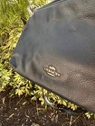 The Coach Black Leather Crossbody Purse with Zipper Closure is a stylish and classic accessory for women. Made of pebbled black leather with silver hardware accents, this rectangular purse features a zip closure and an adjustable crossbody strap. The exterior is solid black with a fabric lining, perfect for everyday use. With its timeless design and Coach Legacy branding, this purse is a versatile and chic addition to any outfit.