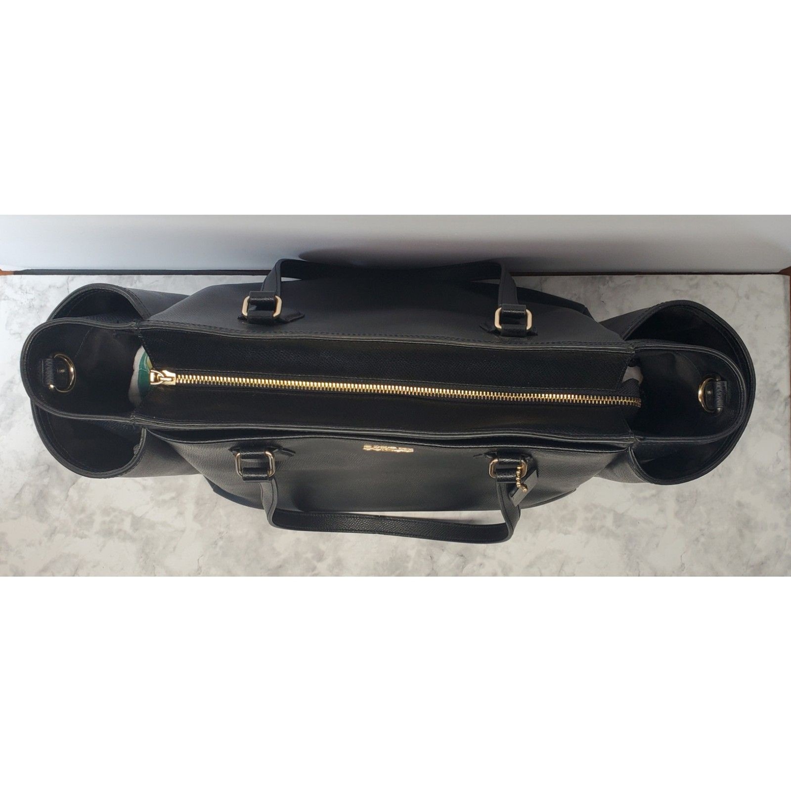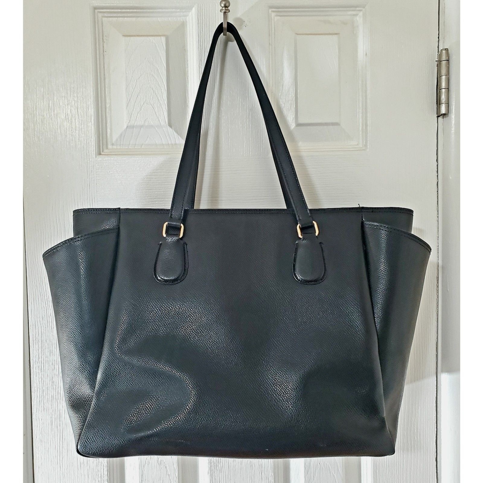 Coach Black Leather Tote Bag – Classic Work & Everyday Purse • Timeless black leather tote from Coach — roomy, practical and versatile for work, school, travel or everyday use. • Double leather shoulder straps, structured rectangular shape, polished gold-tone hardware. • Clean, minimal design makes it easy to pair with casual or professional outfits. • Interior is spacious — perfect for laptop, documents, books, or daily essentials. • Exterior shows light to moderate signs of normal use (see photos). Leather remains supple; straps and hardware are solid. Please review all photos carefully. • Approximate age: 2008 (estimate based on design and Coach production code era — see info below). • Authentic Coach bag; I did not notice any obvious faults (no major scratches, tears, or odors). • Dimensions: (roughly) large tote size — ideal for daily commuting or weekend travel. Great for: Work / office / commuting Student / school / college bag Everyday city bag or travel carry-on Anyone who loves timeless, minimalist leather totes