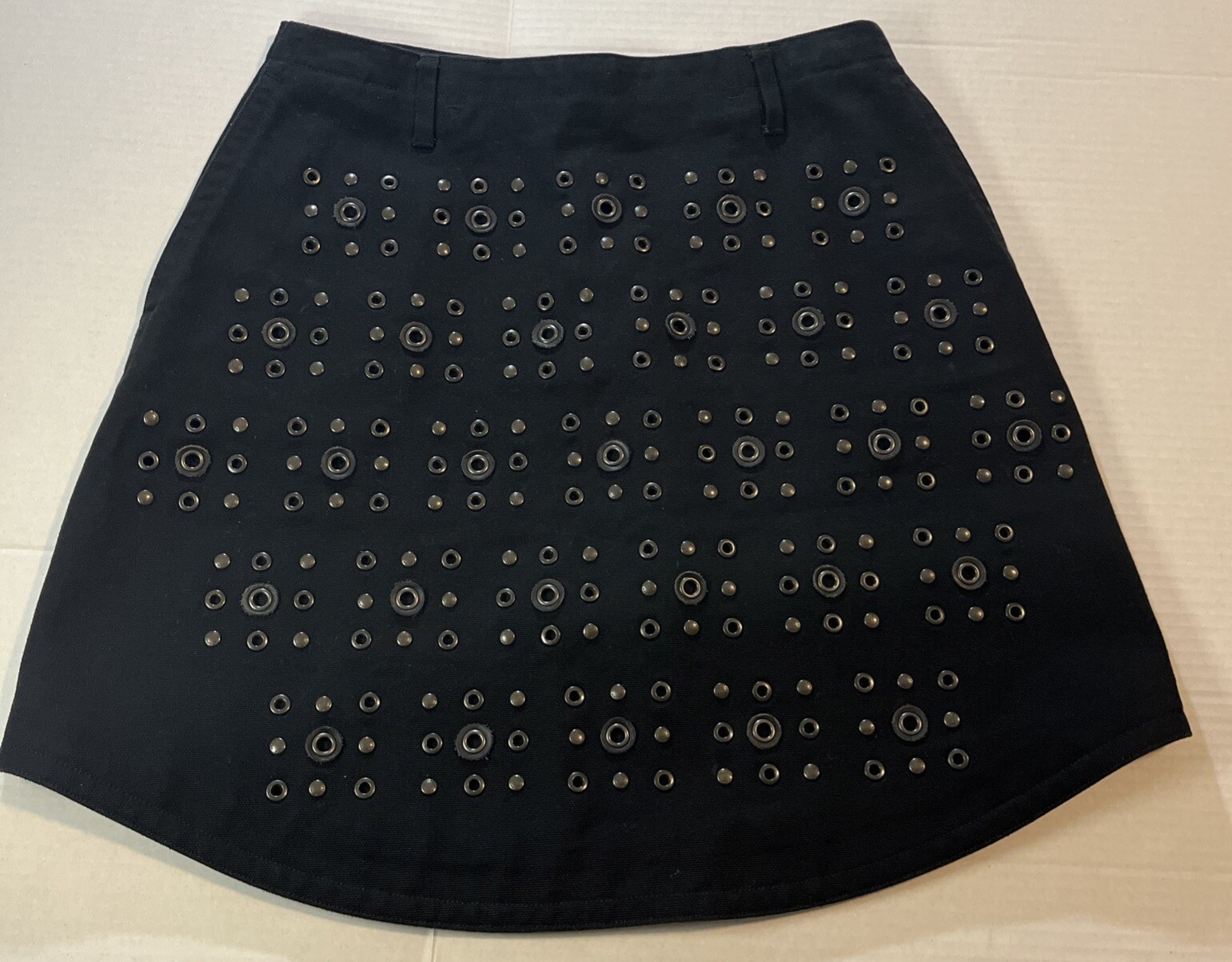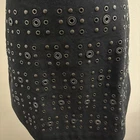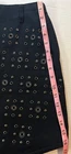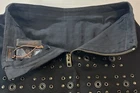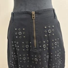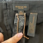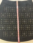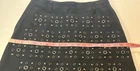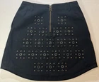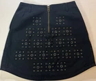 Introducing the Coach Black Mini Skirt with Rivets in size 2, perfect for adding a stylish touch to your wardrobe. Made from cotton with leather trim accents, this skirt features a zip closure and mid-rise fit. The black color and rivet pattern give off a modern and edgy vibe, ideal for various occasions such as travel, parties, or casual outings. With a short length and lined interior, this Coach skirt is a versatile piece that can be worn throughout all seasons, making it a must-have for fashion-forward women looking to make a statement with their clothing choices.