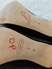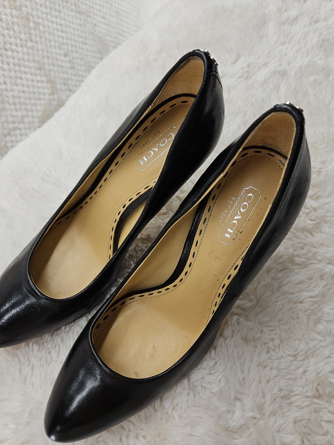 These are pre-owned Coach platform pumps in black, size 7B. They feature an almond toe, slip-on closure, ultra high stiletto heel, and leather upper with logo accents. The heels have a platform height of .5 inches. These stylish pumps are suitable for various occasions such as weddings, parties, formal events, and business settings. They are lined, cushioned, and designed for comfort in the summer, fall, and spring seasons....B1080