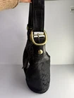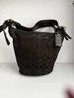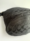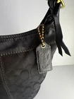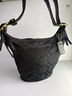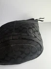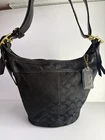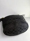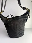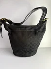 Coach Bleecker signature canvas hobo or bucket shoulder bag, specifically style number 11437. It is made of black signature canvas with black leather trim and gold-tone hardware. Product Details Feature Detail Brand Coach Style Name Bleecker (sometimes referred to as Duffle or Bucket) Style Number 11437 Material Signature canvas with leather trim Color Black with a black signature pattern Hardware Gold-tone Features Single adjustable strap, top zip closure, interior pockets, and a Coach hang tag Excellent condition
