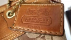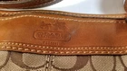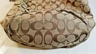 Up for sale is this Coach Bleecker purse, model F0768-11437. It is new with tags and minor flaws, retail $298.00 with a Navy Exchange tag of $239.00. This lovely Bleecker purse in Signature Jacquard Brown Khaki Saddle color with rich brown leather trim and handle. It has the Coach "C" logo all over. It has an inner zip pocket and two accessory pockets inside the main compartment. It measures 12" wide, 10" high and 5" deep with an oval bottom. The handle drop is 12", and is adjustable. It comes with the dust cover bag. The purse is in very good condition, the handle has minor flaws on the edges as shown in photos, but the handle itself is still very sturdy.