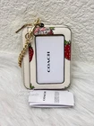 Coach CAR32 Zip Card Case With Strawberry Print Color: Gold/Chalk Multi 100% Authentic Style Number: CAR32 Measurements Length: 3.0" Height: 4.25" Width: 0.75" Materials Printed coated canvas Strap Chain wrist strap with dogleash clip attached Features Open pocket Two credit card slots Zip compartment Additional Details ID window Price is firm