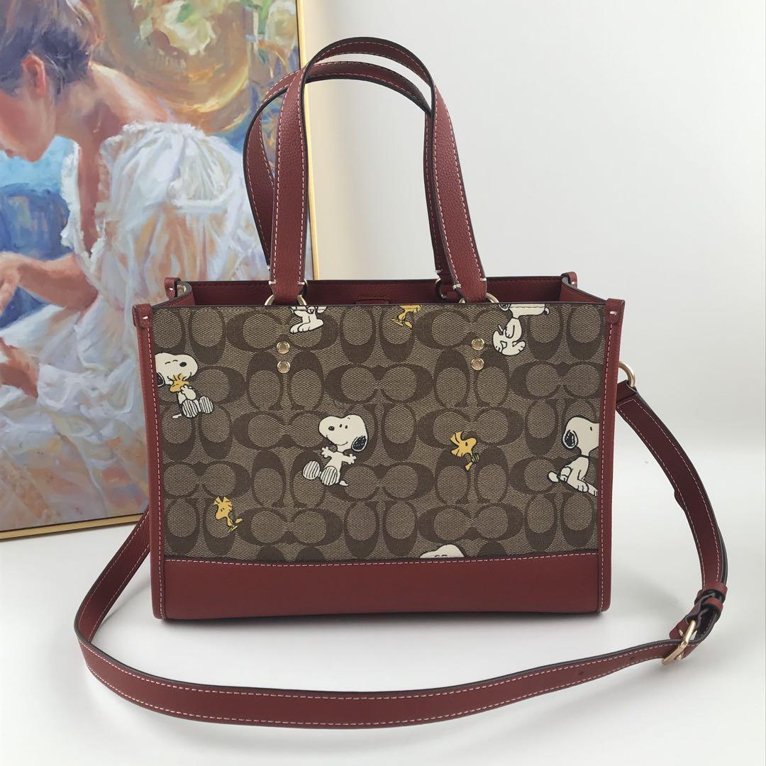 Elevate your everyday style with the Coach Peanuts Dempsey Shoulder Tote Bag, CE862, featuring the charming duo Snoopy and Woodstock. Crafted from rich brown leather and lined with a durable canvas, this medium-sized tote is designed for both practicality and elegance. Its spacious interior, measuring 29cm in width, 22cm in height, and 13cm in depth, is perfect for your daily essentials. The bag's sleek design is complemented by its functional attributes, including a comfortable leather handle and strap in a coordinating hue. Whether you're heading to the office or out for a casual day, this unisex tote, manufactured in Japan, adds a touch of sophistication to any outfit while celebrating the timeless Snoopy theme. The photos are taken under sunlight or indoor lighting, and the color of the product may differ depending on your smartphone or computer. Outlet products are products sold at Coach's direct outlet stores for various reasons, such as having no major scratches due to overproduction, or having scratches that do not interfere with use. Outlet products and direct boutique products may differ slightly in material, pattern position, signature placement, etc., even if they are the same style. Please note. Although we offer them at a discounted price, please rest assured that they are not imitations or inferior products.