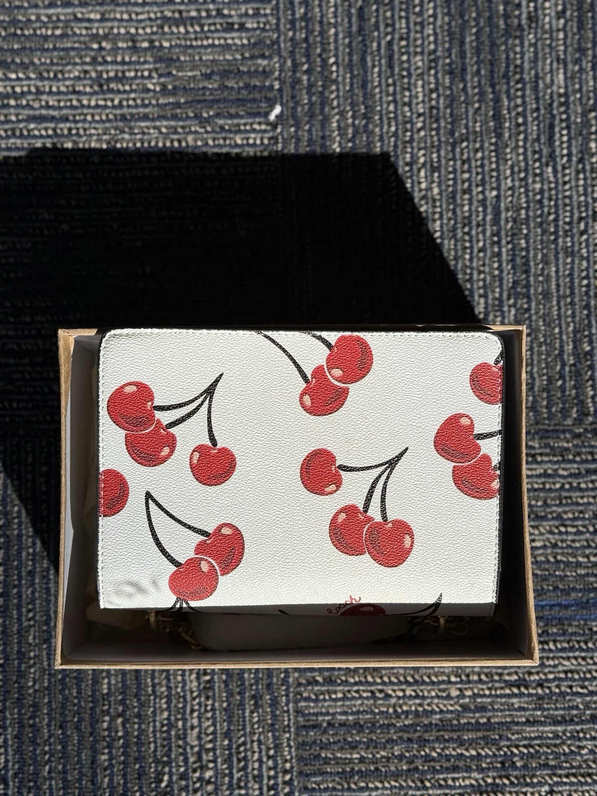 The Coach Cherry Print Crossbody Purse for Women is a stylish and medium-sized handbag made of leather with a fabric lining. It features a chic cherry pattern and gold hardware accents. This versatile purse can be worn as a crossbody with an adjustable leather strap, making it convenient for everyday use. The white exterior color adds a fresh and clean look to the overall design. Perfect for any woman looking to add a touch of elegance to her outfit, this purse is a must-have from the Coach Outlet collection. PLEASE ASK ANY QUESTIONS NEEDED BEGORE BUYING !
