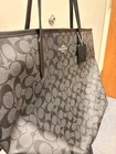 The Coach City Tote Signature Leather Tote in Brown/Black is a stylish and versatile large tote bag perfect for various occasions such as travel, casual outings, workwear, and business meetings. Made with a combination of canvas and leather exterior materials, this tote features a zip and magnetic closure, double handles, and gold-plated hardware. With inner pockets, waterproof construction, and a stain-resistant fabric, this designer tote is both practical and durable. The classic brown and black color scheme adds a touch of sophistication to this timeless and iconic Coach piece.