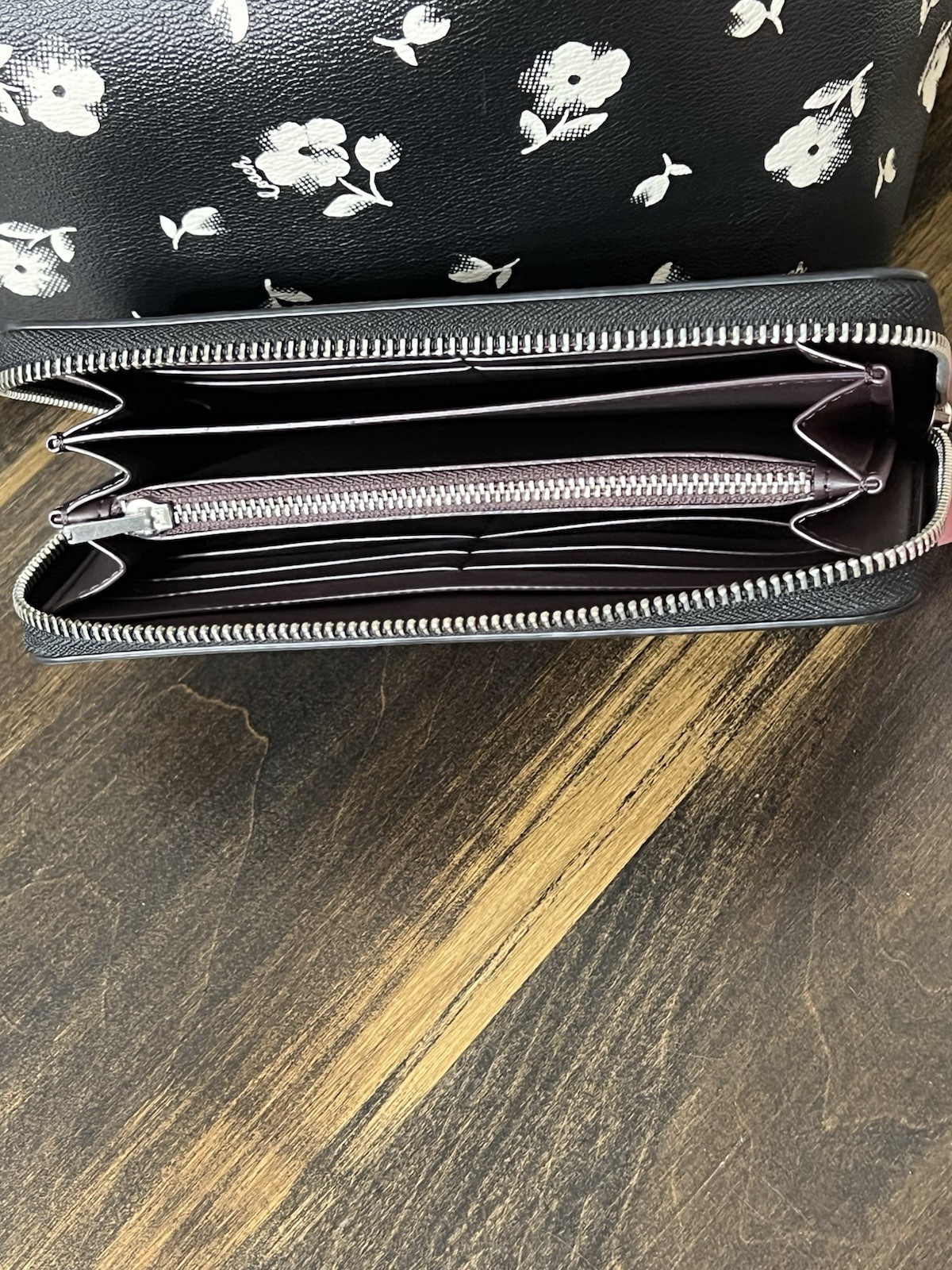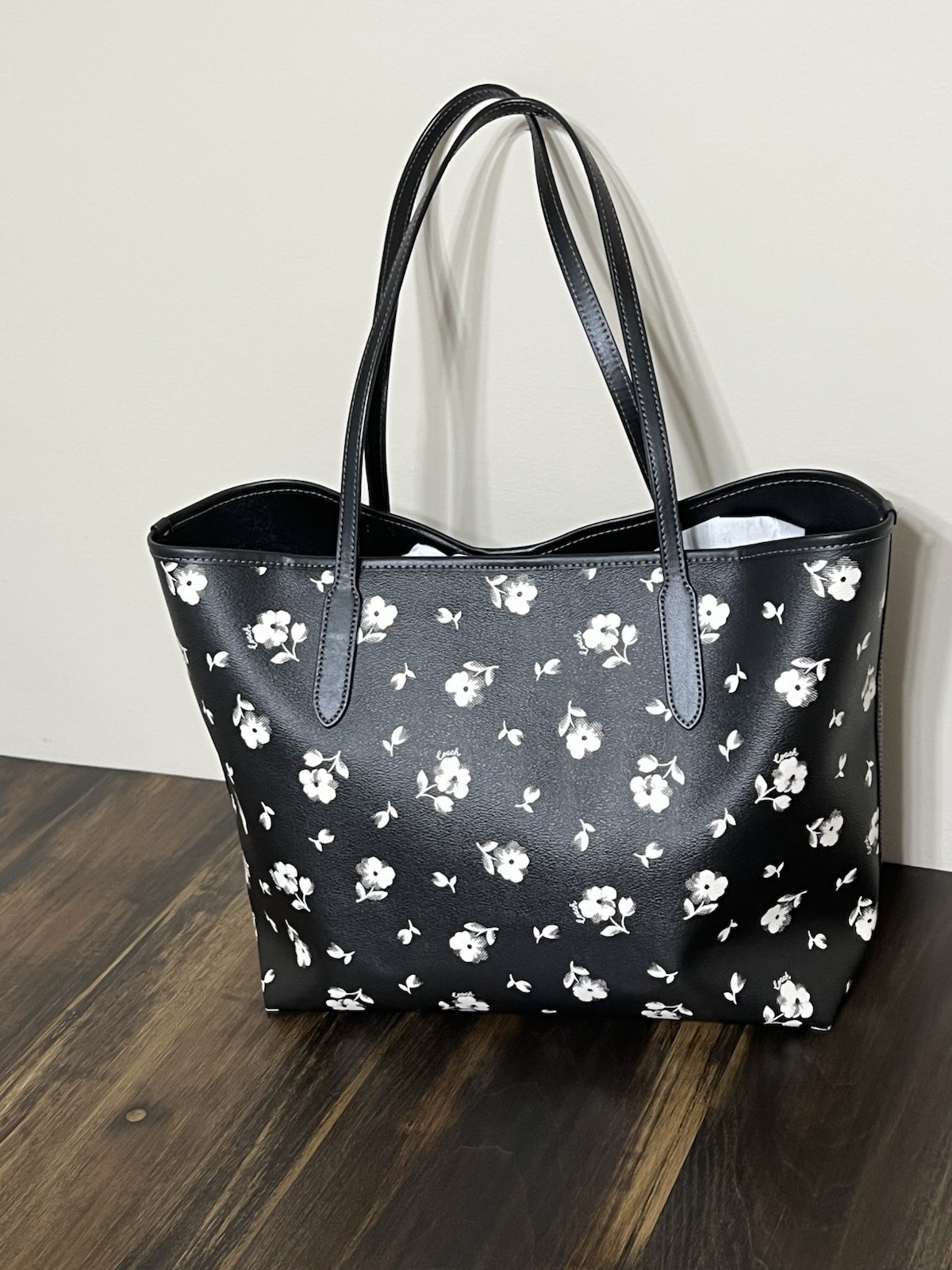 The Coach City Tote & Wallett is a large black leather tote with silver hardware. It features a magnetic closure, black leather double handles, and inner pockets for organization. The tote also includes a bag charm and a floral pattern, making it a stylish and practical choice for everyday use. The coated finish adds a sleek touch to the overall design, while the leather lining provides durability and sophistication. Perfect for women who appreciate quality craftsmanship and timeless style, the Coach City Tote & Wallett is a versatile accessory for any city-loving fashionista.
