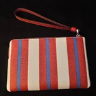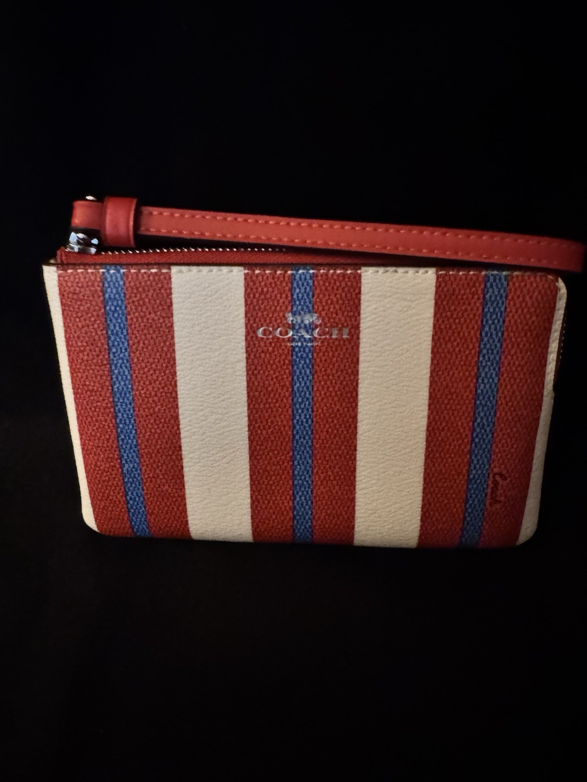 This Coach Corner Zip Wristlet is perfect for any stylish woman looking to add a pop of color to her accessory collection. The wristlet features a red, white, and blue striped pattern and is made of printed coated canvas and leather. It has a zip-around style and measures 6.25 inches in length and 4.0 inches in height. The wristlet is adorned with a strap, zipper, and logo accents, and has credit card features for added convenience. This item is brand new with tags and is one size fits all. It is a great addition to any outfit and is sure to turn heads.
