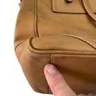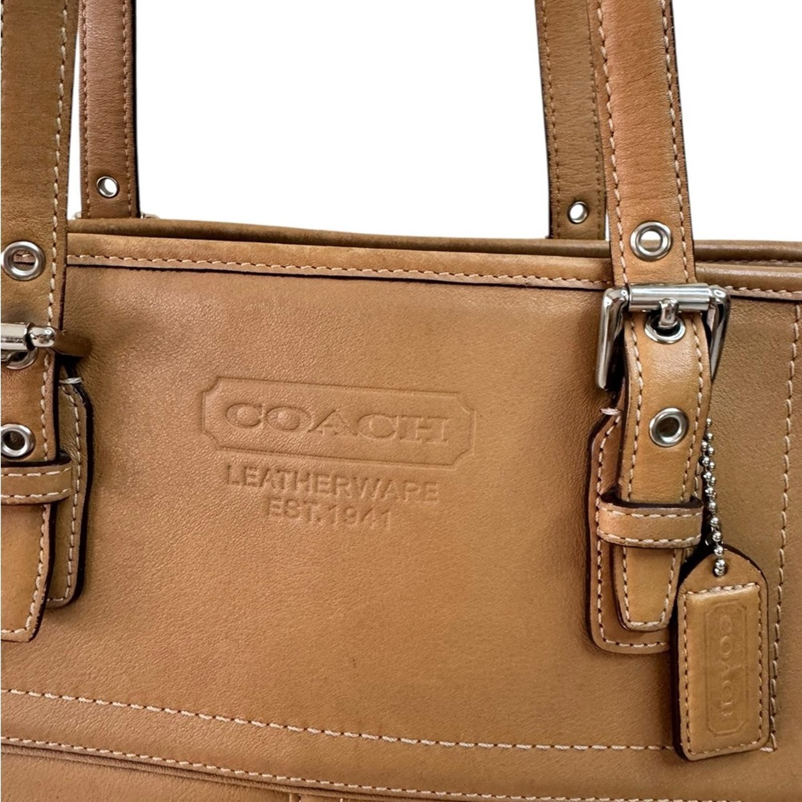 Experience the perfect blend of elegance and practicality with the Coach Tan Leather Tote. Crafted from high-quality leather, this tote features a structured design with double top handles, making it ideal for both professional and casual settings. **Condition: There is corner wear. Piping is exposed. A couple marks on the bottom of the purse. A couple holes on the interior. See pics for flaws and measurements.