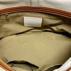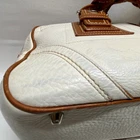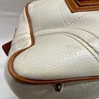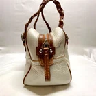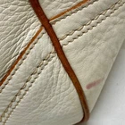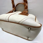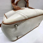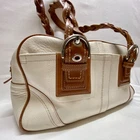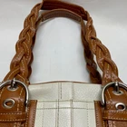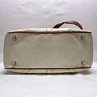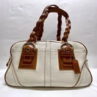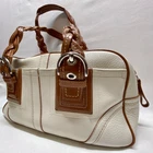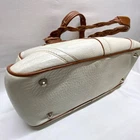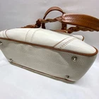 This Coach shoulder bag is made of ivory pebbled leather with brown trim. It features a rectangular shape with double adjustable handles and silver hardware accents. The bag has a zipper closure, lined interior with various pockets, and adjustable straps. It includes a key holder and bag charm accessory, making it suitable for travel, work, or casual occasions. -Exterior has red marks and wear scuffs on all sides as shown up close in the listing photos above. -Interior is in excellent, amazing pre-owned condition. No Flaws. The measurements of this bag are: Width 14 inches, Depth 6 inches, Height 7 inches, and it features an adjustable handle drop of 9 inches to 10 inches. This is a high quality made purse that is sure to last many more years to come. Securely packed and same Day Shipping Thank you for shopping TKO Specialties