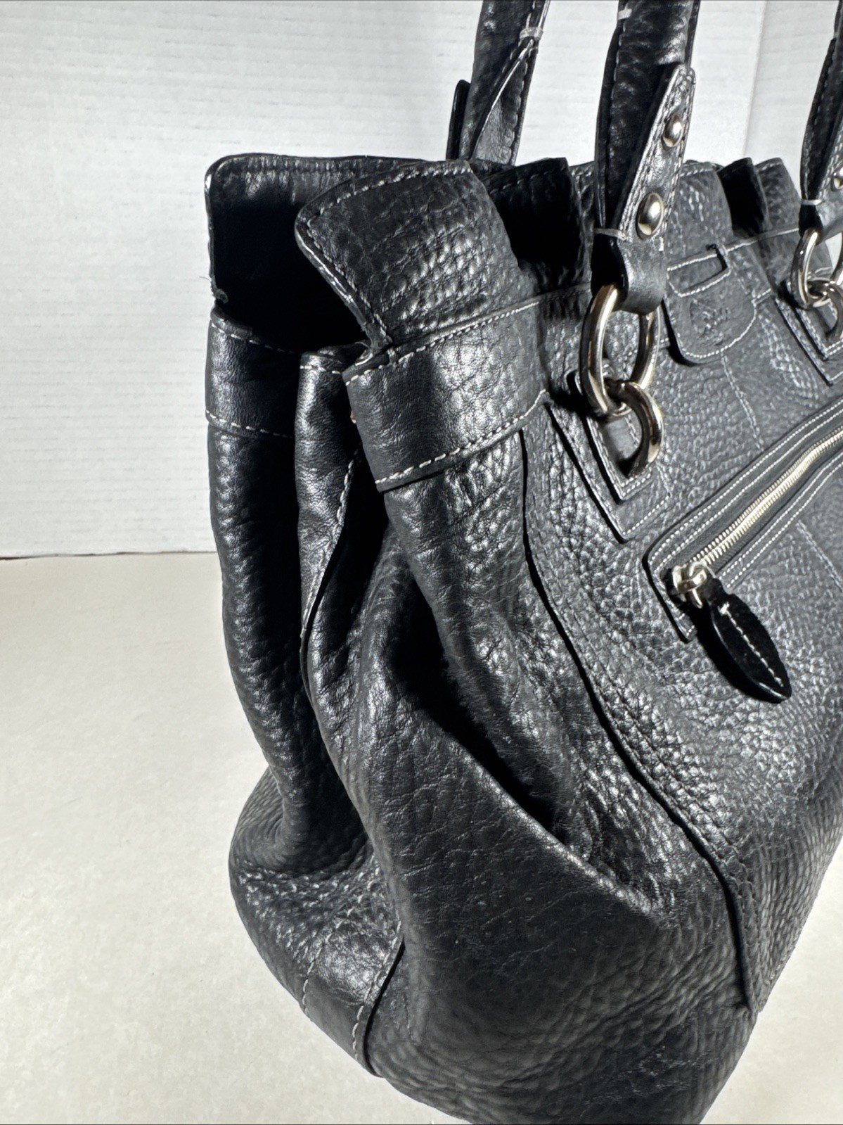 The Coach F14686 Penelope Black Pebbled Leather Satchel Tote is a classic and sleek handbag designed for women. Made from black pebbled leather with silver hardware, this tote exudes elegance and sophistication. The black leather lining adds a touch of luxury, making it a versatile accessory for any outfit. With its spacious interior and stylish design, this Coach Penelope handbag is a must-have for any fashion-forward woman looking to make a statement.