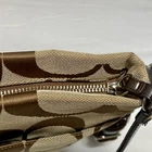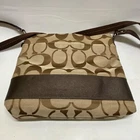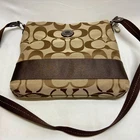 Coach Signature Stripe Crossbody Shoulder Bag F19220 Brown/Tan Classic Jaquard This ladies purse is in good pre-owned condition with minimal signs of use. Please see all photos as this is the exact bag you will receive. Zip top closure, inside liner is clean and features an internal zip pocket and 2 multifunctional slip pockets. Measurements of bag are; 12" w, 10" h and 2" deep. Adjustable strap is currently set to 21". Thanks for looking!