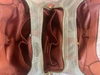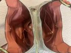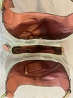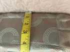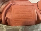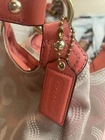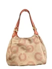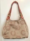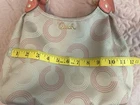 This Coach Madison purse is a stylish and versatile addition to any wardrobe. The beige coral jacquard exterior features a unique dotted Op Art logo pattern and goldtone hardware accents. The double leather handles and 9.5 inch strap drop make it easy to carry and comfortable to wear. The purse has a zip and magnetic snap closure, as well as inner pockets and an organizer to keep all your essentials safe and easy to find. The lining is orange and made of fabric, with a product line of Coach Maggie. This shoulder bag is perfect for any occasion, whether it's for travel, a wedding, a party or cocktail, casual or formal, workwear, or business.Good condition