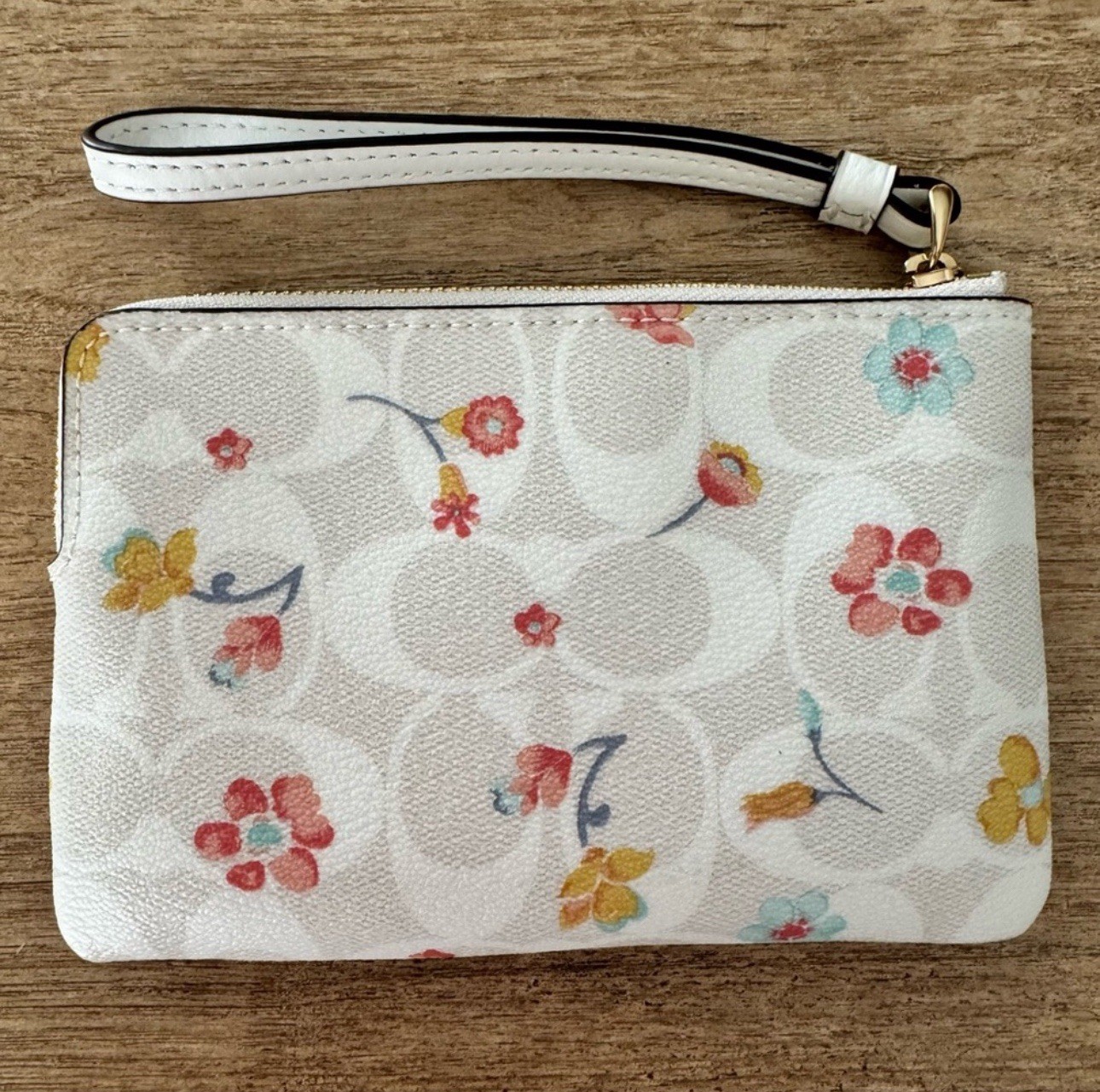Coach Mystical Floral Print Corner Zip Wristlet Printed coated canvas and smooth leather Two credit card slots Zip-top closure, fabric lining Wrist strap attached 6 1/4" (L) x 4" (H) x 1/2" (W) Style No. C8701 So cute for Spring and Summer Smoke free home