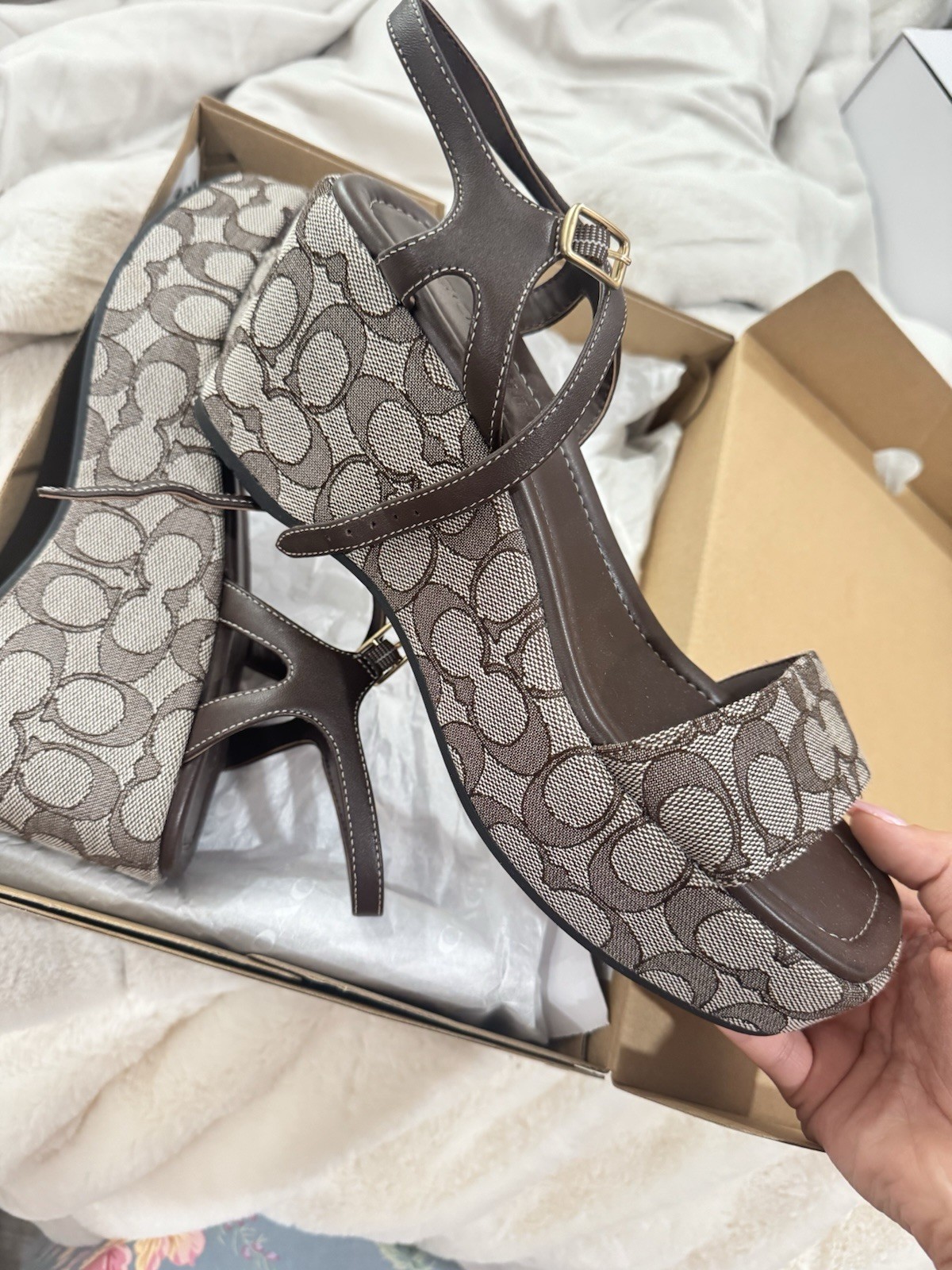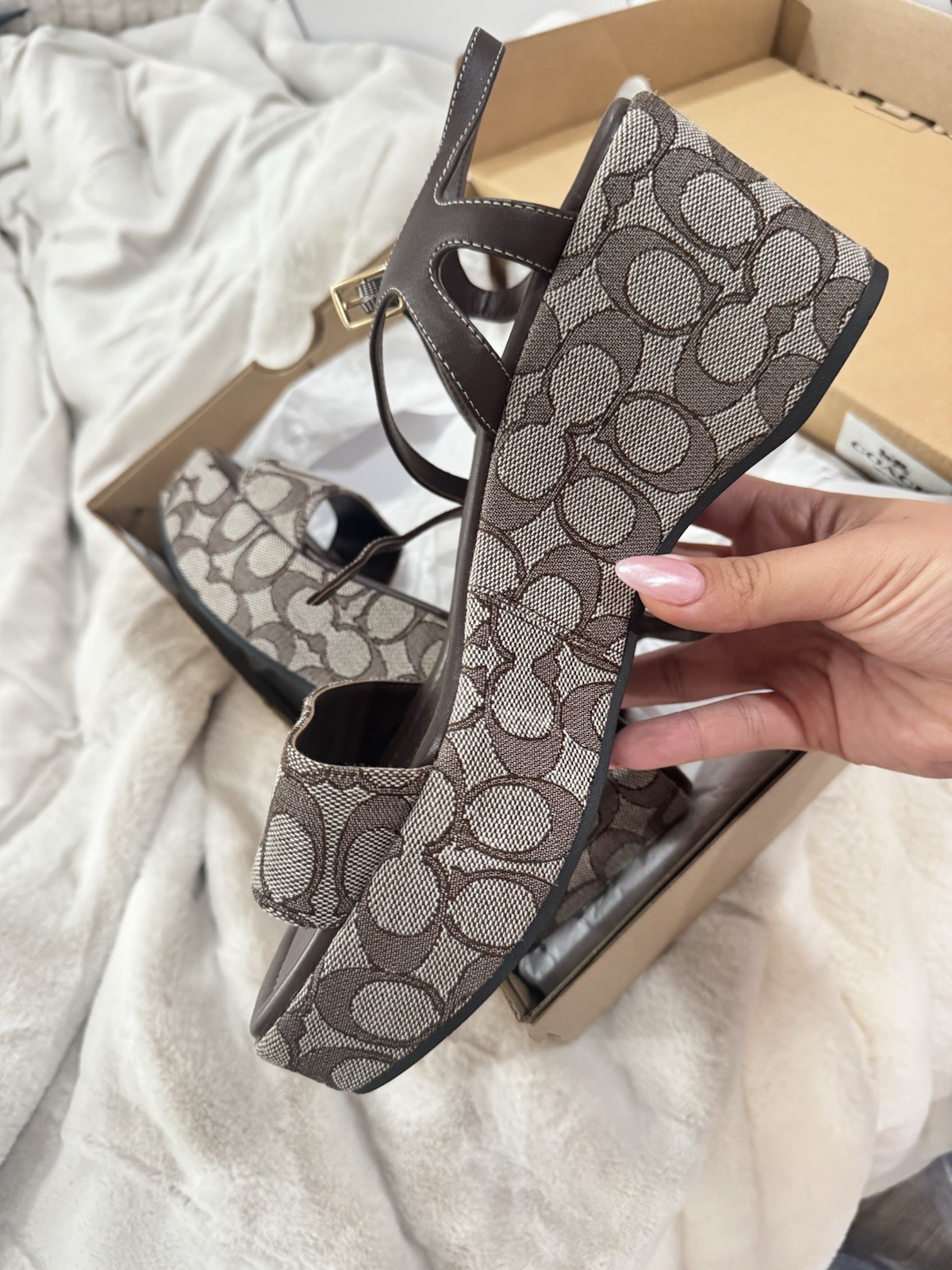The Coach Gale Wedge Sandal in Signature Jacquard - Brown Size 10 is a stylish and versatile sandal perfect for casual occasions during the summer and spring seasons. Made with leather and featuring a strappy design with logo accents, this wedge sandal from Coach is a timeless piece that adds a touch of sophistication to any outfit. The solid brown color and leather lining make it a classic choice for women looking to elevate their footwear collection. Perfect for a day out or a summer getaway, these sandals are a must-have for fashion-forward individuals.