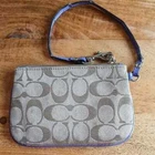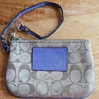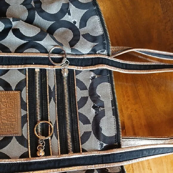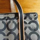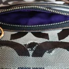 The Coach Black and Gray Geometric Tote and Poppy Wristlet is a stylish and functional handbag set perfect for women on the go. Made of durable canvas material with a sleek geometric logo pattern, this tote features a zip closure and convenient wristlet accessory. The gray exterior and purple lining add a chic touch to the classic design, making it a versatile and fashionable choice for everyday use. Ideal for carrying essentials in style, this Coach Poppy collection piece is a must-have for any fashion-forward woman.