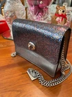 Lovely with tags Leather with suede interior with a beautiful multi-colored glitter fold-over flap and metal turnlock. Chain shoulder strap that can be used on shoulder or as a cross-over. Colors are gunmetal with silver accents. Enjoy! Please see my other Ebay Coach purse listings :) Metallic crinkle leather and glitter Inside zip pocket Turnlock closure Outside slip pocket Strap with 22" drop for shoulder or crossbody wear 7" (L) x 5" (H) x 3" (W) Style No. F37469
