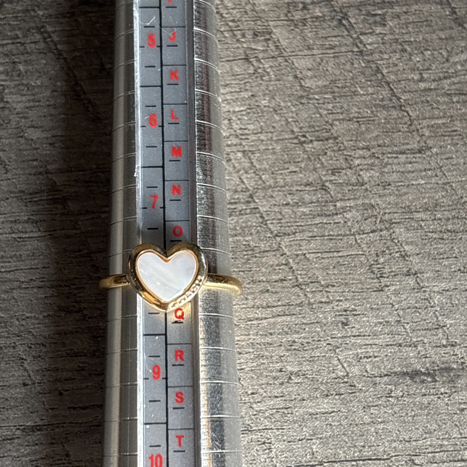 The Coach Gold Tone Mother Of Pearl Heart Ring in size 8 is a stunning piece of fashion jewelry perfect for beauty occasions. This signed ring features a heart-shaped Mother of Pearl/Abalone main stone set in a gold tone, adding a touch of elegance to any outfit. Made in China, this contemporary piece does not offer any antique or customized options, making it a versatile addition to any jewelry collection.