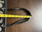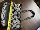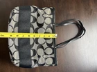This Coach tote bag is a must-have for any fashion-conscious woman. With its iconic striped pattern and signature Y2K logo, this bag is a stylish addition to any outfit. The gray exterior color and silver hardware give it a sophisticated and timeless look, while the gray lining and handle/strap color provide a chic contrast. Crafted from high-quality jacquard material, this tote bag is perfect for everyday use. Its spacious interior and durable design make it ideal for carrying all your essentials. Whether you're heading to work or out for a night on the town, this Coach tote bag is sure to turn heads. Condition: Condition excellent- Shows normal wear but very good, clean lining Type/Closure: Tote Zipper Color: Grey/Black Material: Canvas Approximate Measurements (inches): L9.5 "x W 4 " x H 9.5 " Handle Drop: " Strap Drop: 8.5"