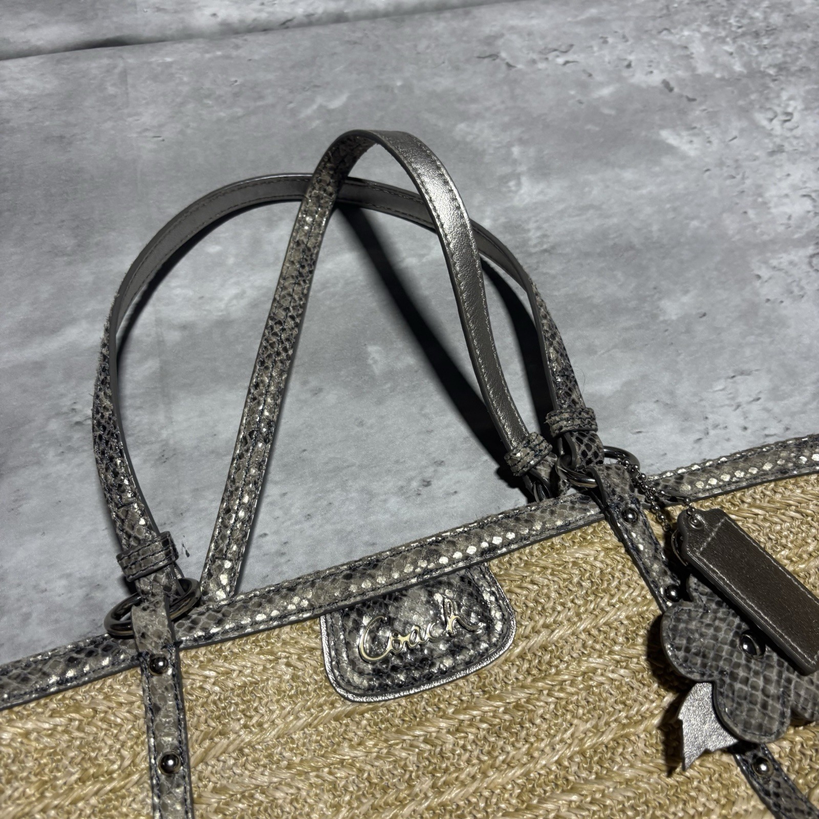 Coach Hampton Straw Python Trim Tote Shoulder Bag 12x10* 10x12x4.5 wear on the straps and edges (See photos) zippers are in good condition Good condition otherwise No other rips, holes, stains or smells. See photos for measurements and details. If any flaws are mentioned above they will be visible in the photos. All items have been cleaned to ebay standards. We ship 5 Days a week Monday through Friday so expect your items to arrive quickly! If you have any questions feel free to reach out!