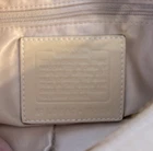This Coach handbag is a pre-owned cream leather carryall from the Hampton collection. It features a pebbled pattern with gold hardware accents, a tassel detail, and a belted design. The bag has a zippered closure, fabric lining in beige, and measures 14.5" in width, 9" in height, and 5.5" in depth. It is a satchel style tote with a heavy-duty construction and is adorned with the Coach logo. Small stain on interior but exterior is in beautiful condition Smoke-free home
