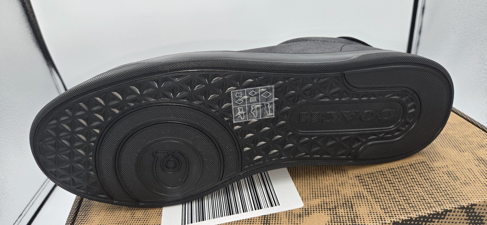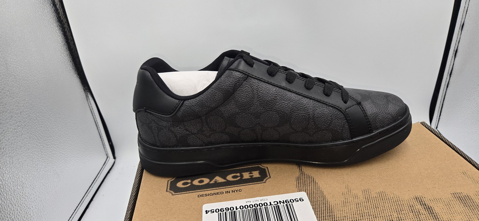 Brand: Coach Style: High Line Signature low-top tennis-style sneakers with monogram coated canvas uppers and smooth leather trim. Color: Graphite/Black Gender: Mens Size: US 11 D (UK 10.5 D, EUR 45 D, CN 285 D) Style/Model name and code (per box): HIGH LINE SIG SNK, CCN62MFQ 11009060JAX Details: Lace-up closure, padded collar, Coach New York logo at tongue and heel, all-black rubber outsole with Coach branding, classic signature C pattern. UPC: 196395924592