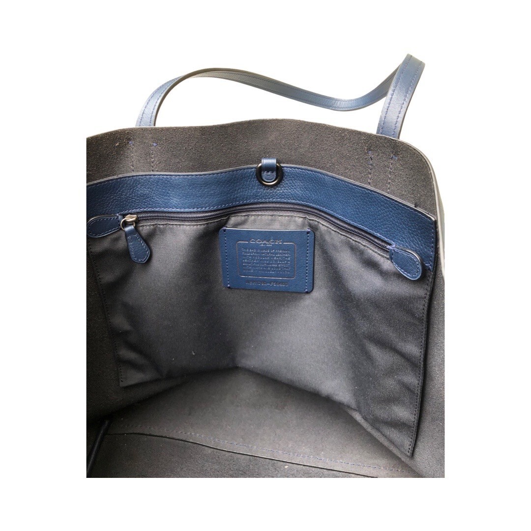 The Coach Hudson Tote Bag is a stylish and spacious handbag designed for women in navy blue leather. This XL size tote features the signature Coach Hudson model, making it a versatile and fashionable accessory for everyday use. With its durable exterior material and classic tote style, this handbag combines both functionality and sophistication, perfect for any woman looking for a high-quality and fashionable accessory. The length is 13", the width is 19" and the straps are 31" measured in the whole loop.