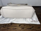 This elegant shoulder bag by Coach is a must-have for any woman's wardrobe. Crafted with high-quality ivory leather, it exudes class and sophistication. The exterior color is a creamy shade that is neutral enough to match any outfit, while the interior boasts a rich brown lining that adds a touch of warmth. This pre-owned Coach handbag is perfect for the fashion-conscious woman who values quality and style. The bag features the iconic Coach logo and is designed to hold all your essentials. Whether you're heading to work or a night out, this shoulder bag will elevate any outfit.
