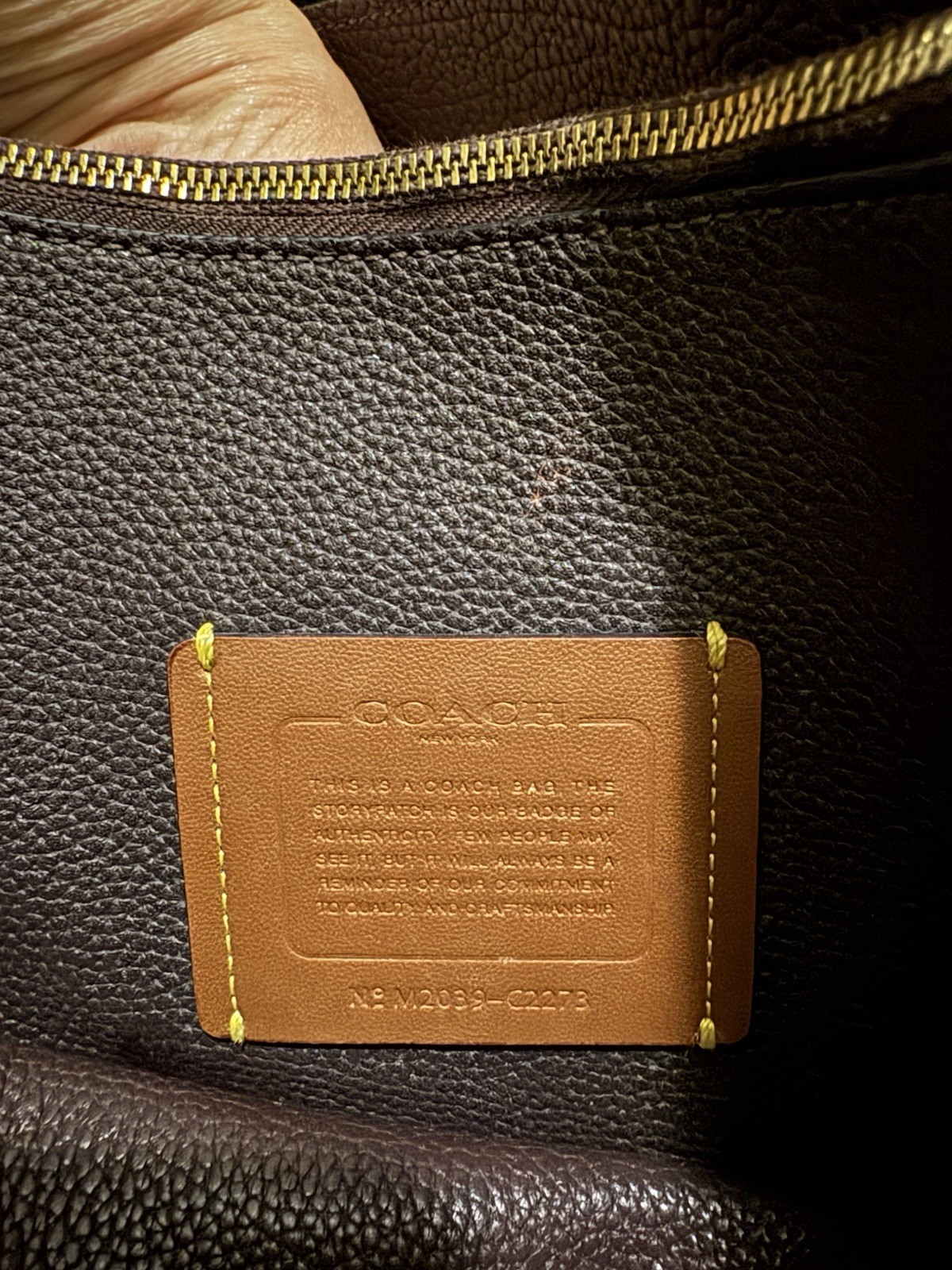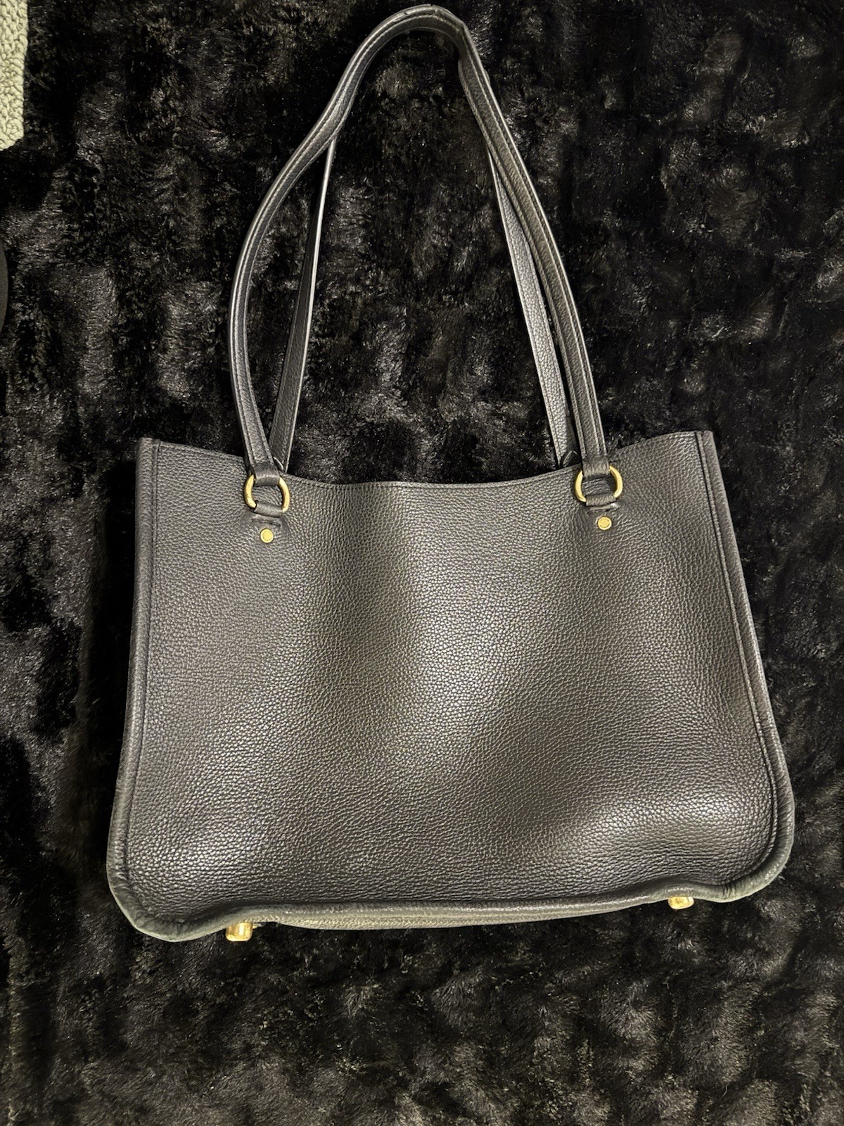 The Authentic Coach Large Black Leather Tote Bag is a classic style handbag with a timeless design. Made from high-quality leather with a solid pattern, this tote features double black leather handles, gold hardware accents, and spacious inner pockets for organization. The zip closure ensures your belongings are secure while on-the-go. The black exterior and lining add a sleek and versatile touch, making it a stylish choice for everyday use. Complete with a bag charm, this Coach tote is a must-have for any fashion-forward woman looking for a spacious and sophisticated handbag. Fits a small laptop