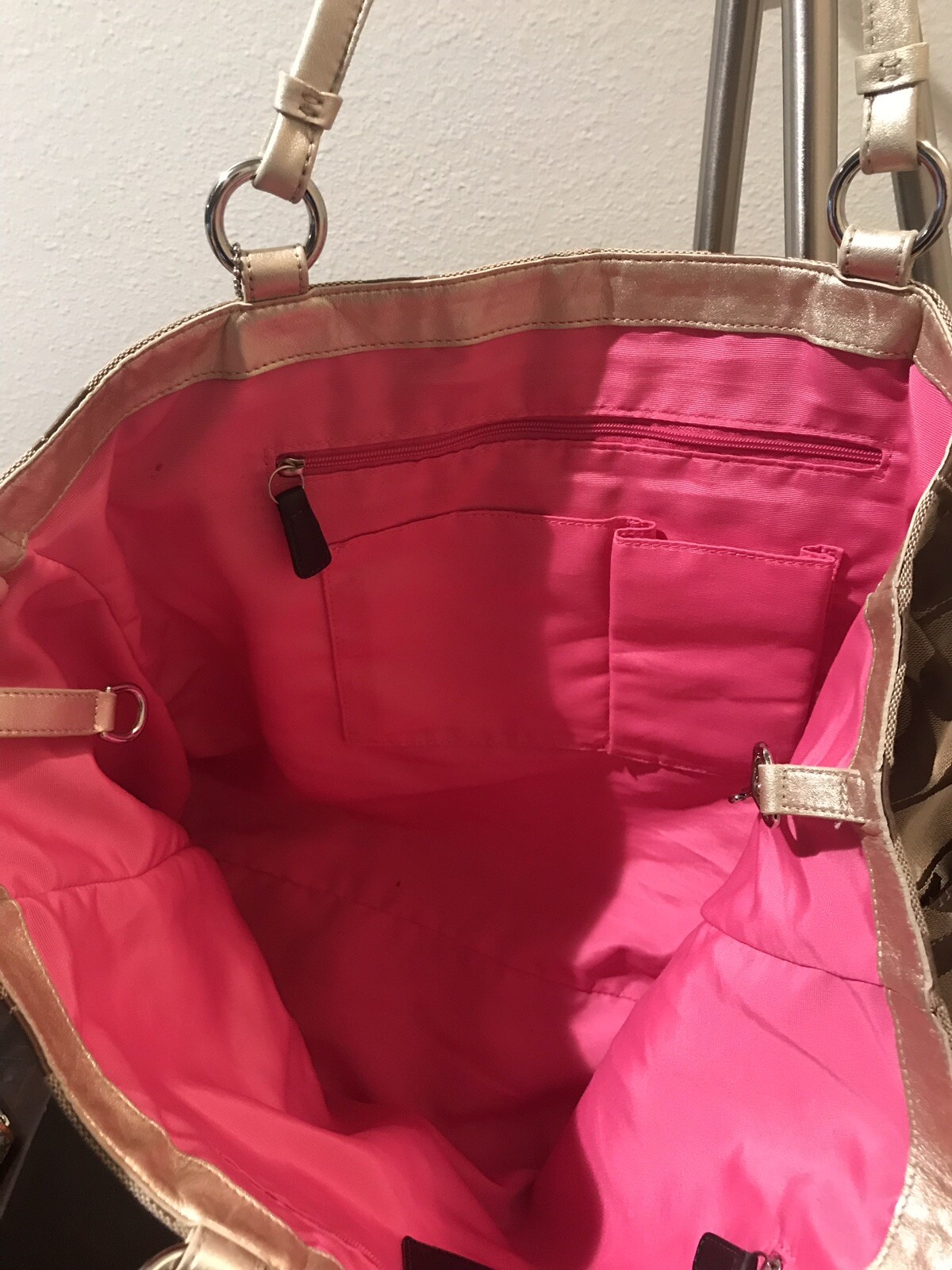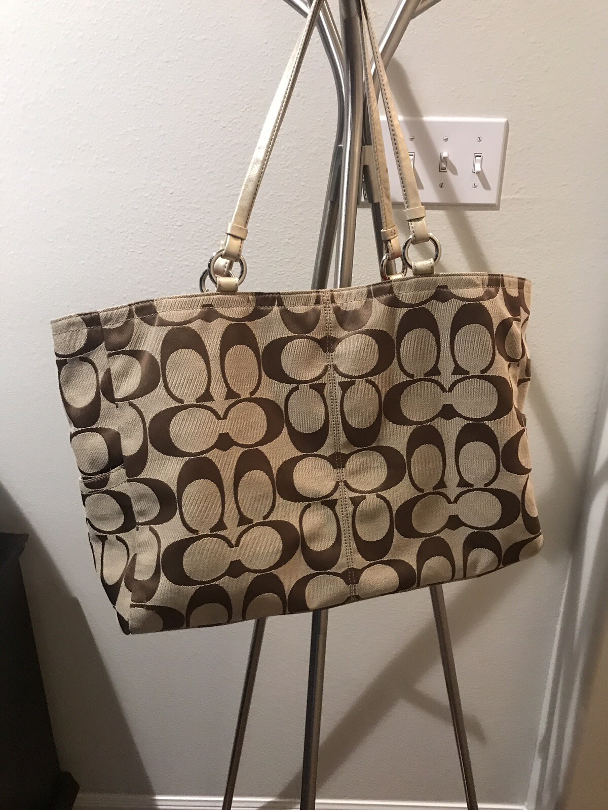 Coach handbags used large pre-owned Signature Pint Fabric Tote Gold. Condition is Pre-owned. Shipped with USPS Priority Mail.