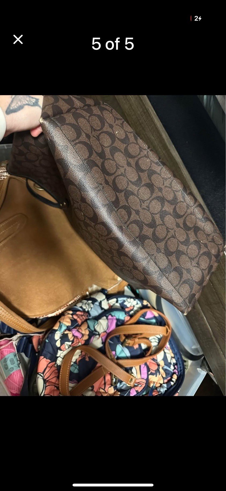 The Coach Large Tote Bag in Beige/Brown is a stylish and spacious purse with a signature logo pattern and double beige handles. Made of leather with brown accents, this tote features a zip closure and a cute bag charm. It is perfect for everyday use, adding a touch of designer flair to any outfit. The exterior and lining are both beige, making it a versatile accessory for any woman's wardrobe.