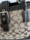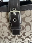 This Coach handbag is the perfect addition to your collection. Made with a combination of leather and canvas materials, this medium-sized tote shopper is both stylish and durable. The brown exterior color is signature canvas and the leather handle/strap make it comfortable to carry around. The bag measures 14 inches in length and 8.5 inches in height, with a strap drop of 8 inches. This Coach handbag is perfect for women who want a mix of style and practicality. Add it to your wardrobe today! Bag is in very good condition . There is some stain inside which is shown in the pics. Comes with a zippered large pocket inside and outside and cell phone pocket. The bag is very spacious inside with lots of room to fit your items. You can unbutton the sides to expand the bag.