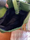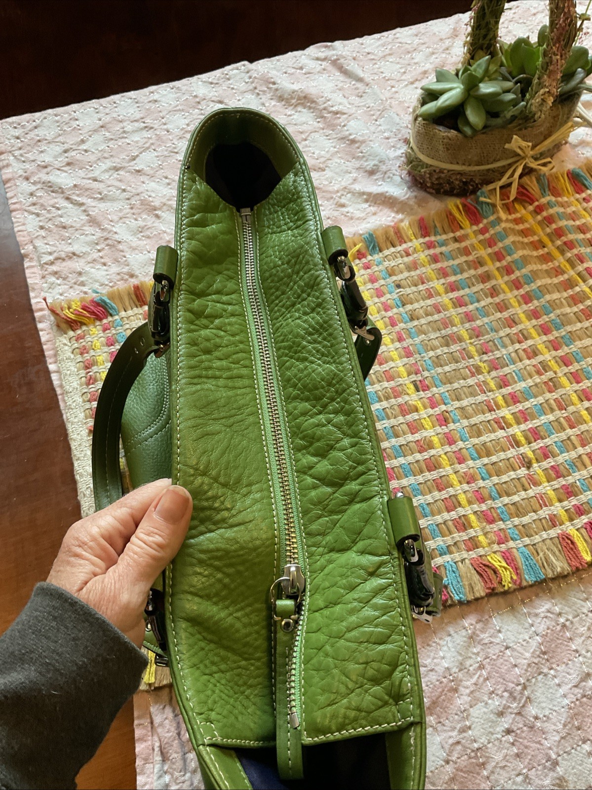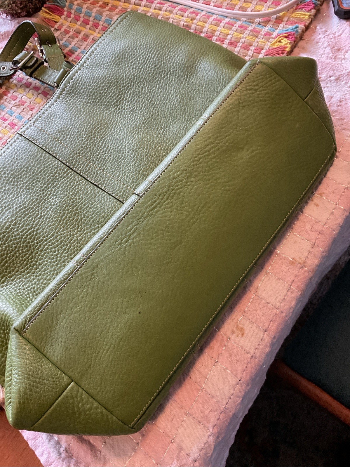 The Leather Green Tote Bag with Dual Handles by Coach is a medium-sized rectangular tote bag made from pebbled leather with a zip closure. It features dual green leather handles, silver hardware accents, and inner pockets for organization. The exterior color is a classic solid green, with a blue fabric lining. Perfect for everyday use, this designer tote exudes a timeless style with its pebbled finish and silver hardware details. Ideal for women who appreciate quality craftsmanship and a classic design. Excellent condition inside and out. A vintage classic