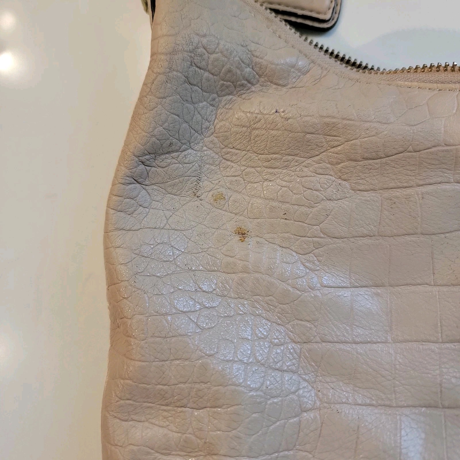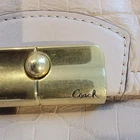 This beautiful Coach hobo bag features a soft croc-embossed leather in a nude/beige tone, paired with a luxurious blush pink satin lining. The bag includes a front pocket with a signature gold turn-lock closure and a roomy interior with slip pockets for easy organization. Condition: This bag is pre-owned and shows visible signs of use, mainly on the back and near the strap rings (see photos). Some discoloration, marks, and wear are present on the leather, as well as surface wear on the gold hardware. The interior is clean. All stitching and the zipper are intact. Please review all photos carefully as they are part of the description. Features: Genuine leather with croc-embossed texture Gold-tone hardware Front flap pocket with Coach turn-lock Blush pink satin interior Interior slip pockets Comfortable shoulder strap Color: Nude / Beige Interior: Blush Pink Closure: Top zipper Style: Hobo / Shoulder Bag A stylish and elegant everyday Coach classic with plenty of life left.