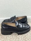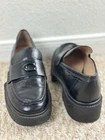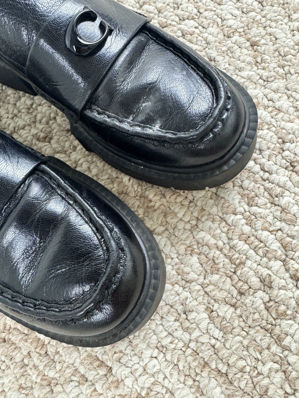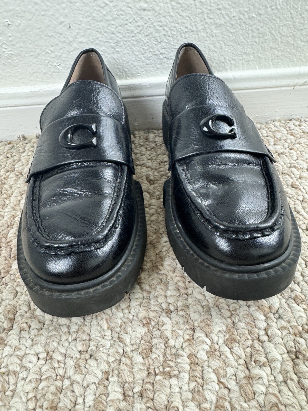 Coach Leather Leah Platform Loafers in size 7 are stylish and versatile flats perfect for casual, business, or special occasion wear. Featuring an almond toe shape and slip-on closure, these slip-on loafers are crafted from black leather with a comfortable leather lining and insole. The lug sole provides added durability and a trendy touch to the classic design, making them a must-have addition to your shoe collection. Whether it's winter, summer, fall, or spring, these Coach loafers are a timeless and elegant choice for any season loafers in good condition.