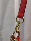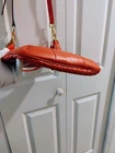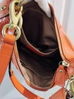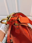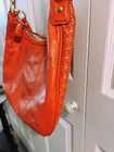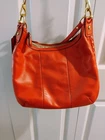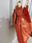 The Coach Leather Orange Shoulder Bag is a stylish medium-sized handbag made from leather with a solid orange back exterior. The front exterior is a small braid design. It features a 7 1/2" front pocket with a unique goldtone snap closure engraved with 'Coach', and perfect for added sophistication, convenience and security. The bag includes a shoulder strap and 1 handbag strap made from orange leather and a fabric lining in outstanding gold.