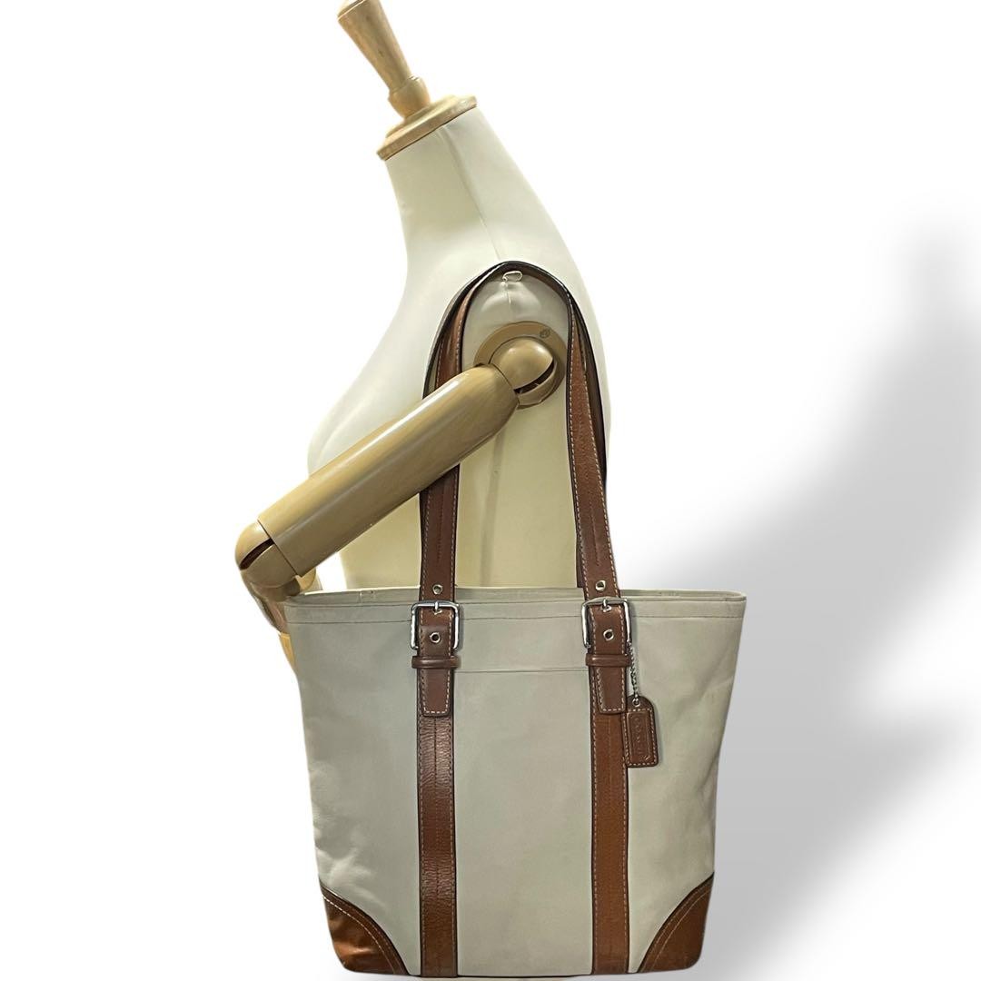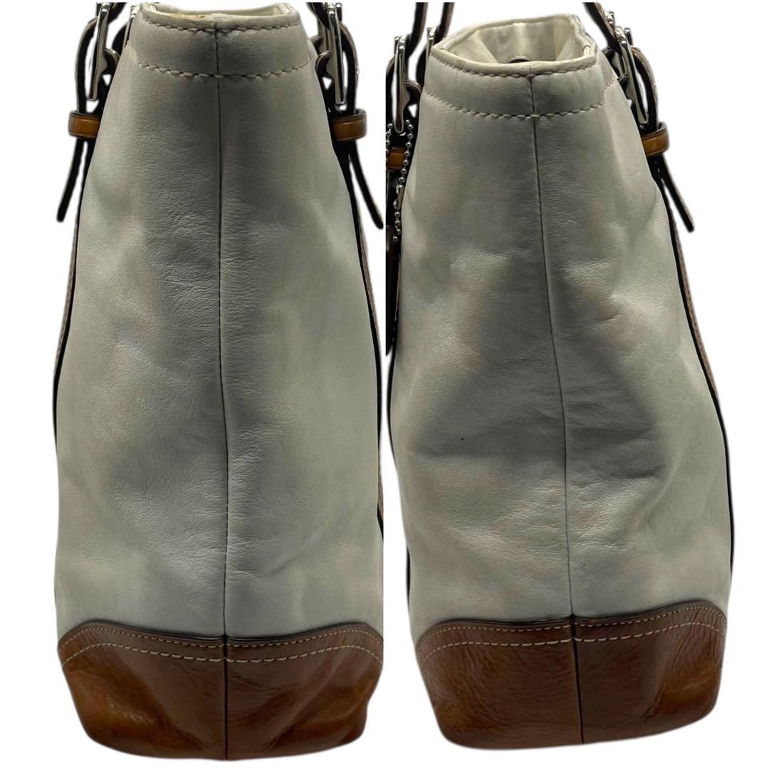 This Coach tote is a total steal! The rich brown and off-white leather combo is so chic and versatile. It's surprisingly roomy yet keeps its shape beautifully. The leather feels luxurious and has aged gracefully—just the right amount of character. Shipping was faster than expected, and the seller provided great updates. Perfect for work or weekends, this bag elevates any outfit. Definitely worth every penny!