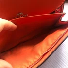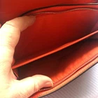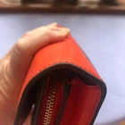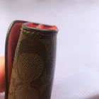 Coach Signture PVC Slim Envelope Wallet in Khaki/Red Orange with Silvertone hardware. Features: -Signature PVC with crossgrain Leather -12 bank /store card slots -Full-length bill compartment -Zip pocket -Snap closure -Outside open pocket See pictures on callouts: ink mark inside of flap, one torn card slot but slot is still functional, small ink mark on another card slot, bill slot needs cleaning. Zipper and snap are in good working order. No callouts noted on the outside of wallet. Measurements are: 8" length & 4" wide and approx. 1" diameter Coach number is E1792/F54022 Inventory Item #24-105