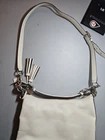 This is a stylish and vintage Coach Legacy Courtenay Crossbody Handbag Purse that measures 13 inches in width and 13 inches in height. It comes with a white colored handle/strap made of leather material and silver hardware color. The exterior is in tan color made of durable material, making it a perfect accessory for any outfit. In addition, this medium-sized purse has a zip closure, making it secure for your personal belongings. It also features a bag charm accessory that adds a touch of elegance to the purse. This Coach Legacy Leather Courtenay Crossbody Handbag Purse is perfect for women who love vintage styles and want to add a touch of luxury to their wardrobe.
