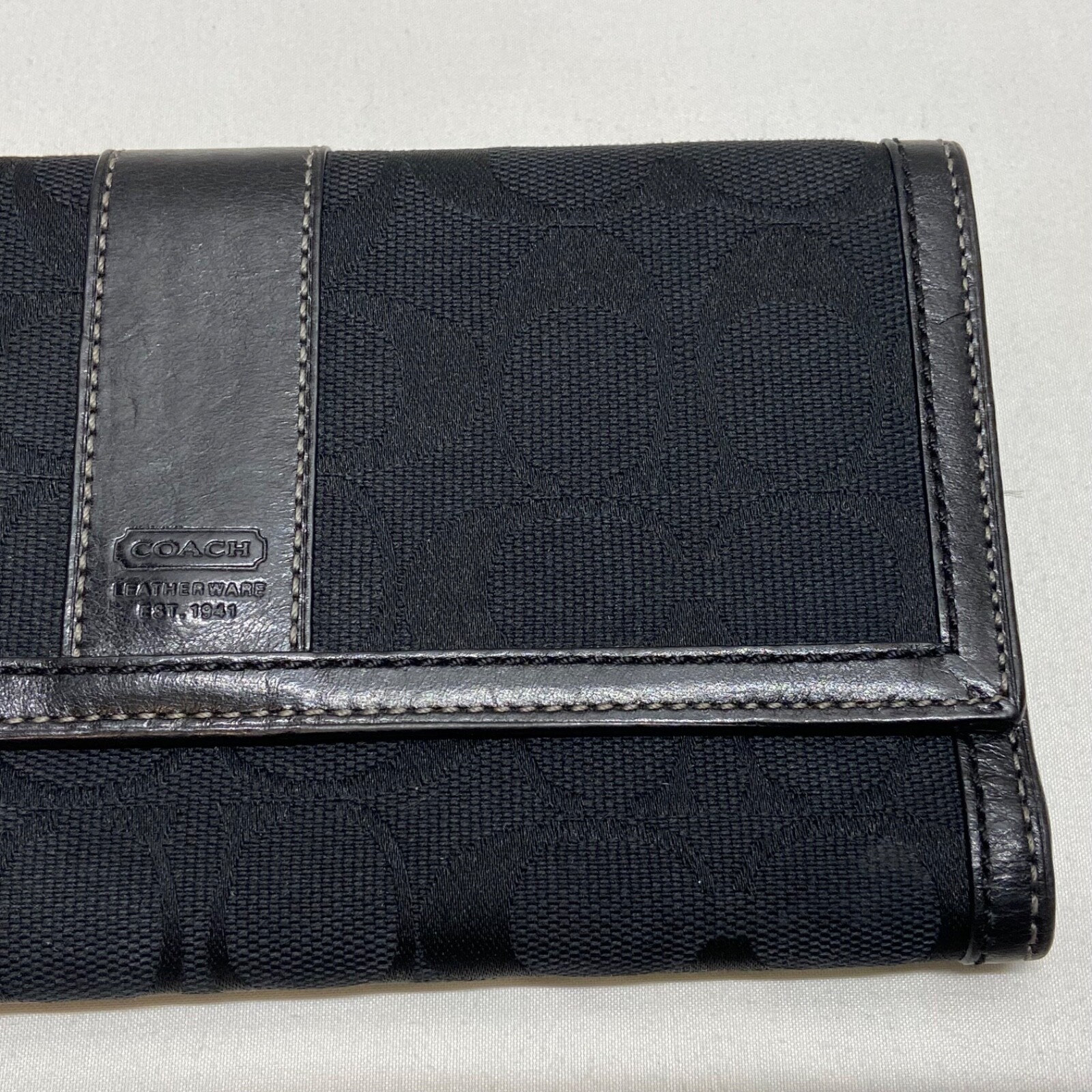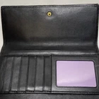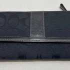 Coach Legacy Slim Trifold Wallet Signature Logo Black Canvas Leather Trim EUC This ladies wallet is in excellent pre-owned condition with minimal signs of use. Please see all photos as this is the exact item you will receive. Snap Front closure, inside features 6 card slots, ID slot and bill holder. There is also a zippered coin pocket on the back. Dimensions are 7.5" w, 4.5" h and .5" deep. Thanks for looking!