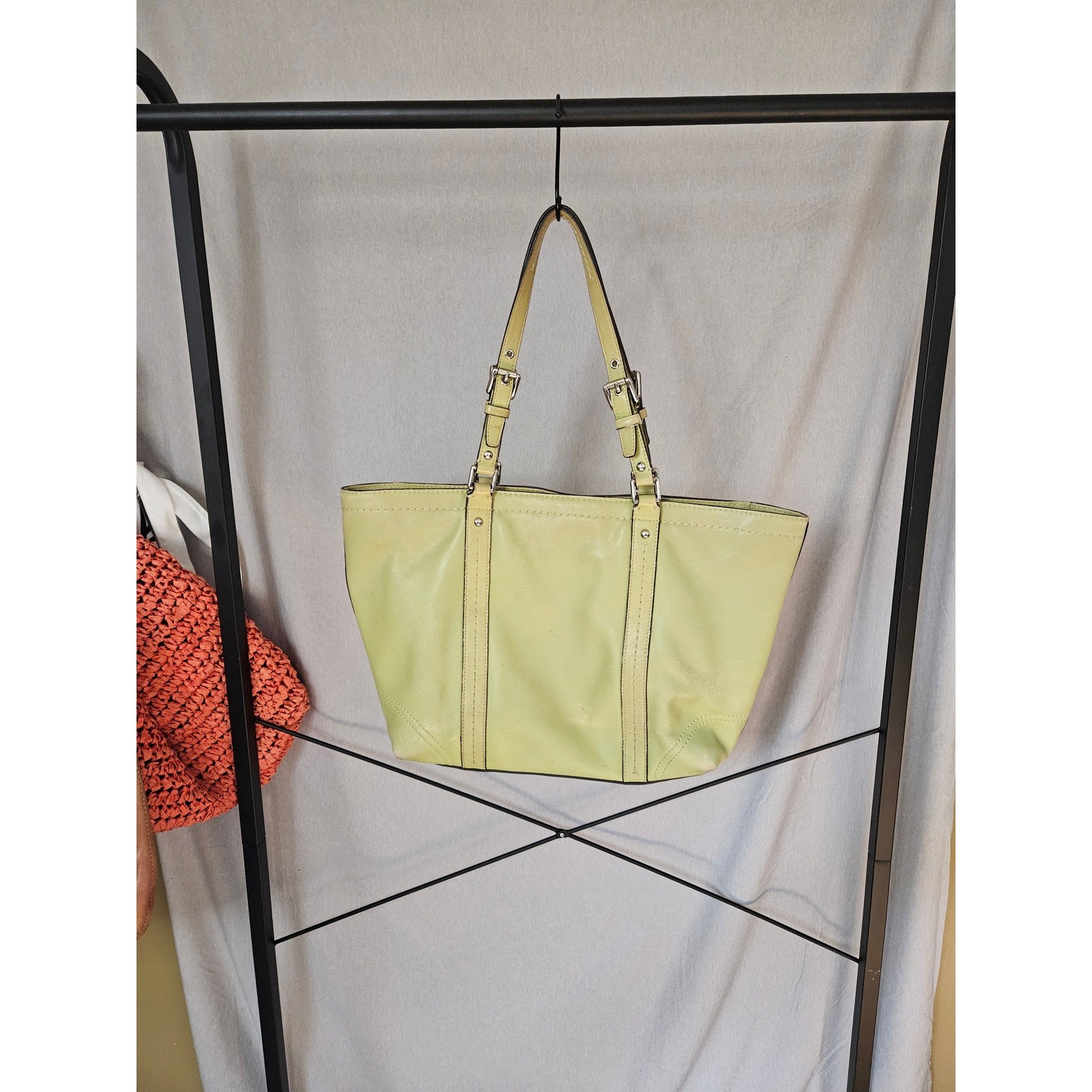 Add a bold pop of color to your wardrobe with this stunning Coach East West Gallery Tote in lime green leather. This spacious and stylish tote features a sleek, structured silhouette with signature Coach details. Size: 16" W x 10" H x 3" D Material: Genuine leather Color: Lime green Condition: Pre-loved with some visible wear (see photos), but overall in great condition and full of life. A perfect everyday bag with personality — roomy enough for your essentials and then some. A rare find for any Coach collector or lover of vintage designer style. Coach tote, Coach shoulder bag, lime green purse, leather tote bag, designer bag, vintage Coach, East West Gallery Tote, Y2K Coach, structured tote, pre-owned Coach, Coach handbag, statement bag, colorful leather bag, rare Coach bag, everyday tote