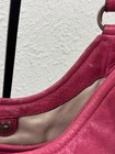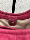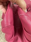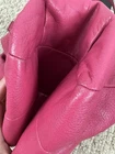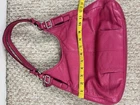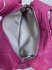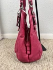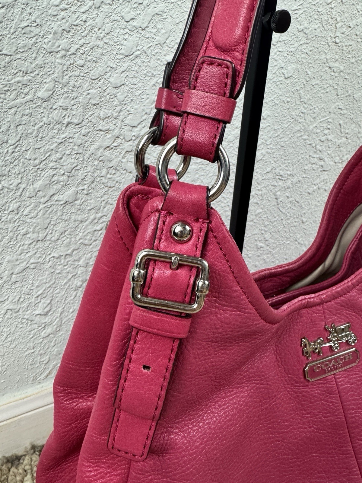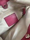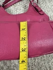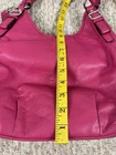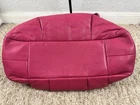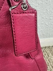 Coach Madison Maggie Fuchsia Shoulder Bag is a medium-sized shoulder bag made from soft leather with a fuchsia exterior and silver hardware accents. The bag features signature "C" pattern, zip and magnetic snap closure, and double handles in matching fuchsia color. It is suitable for various occasions such as travel, parties, casual outings, work, and business meetings. The interior is lined with fabric and includes inner pockets and dividers for organization. This designer bag also comes with a bag charm and original dust bag, making it a stylish and practical accessory for any woman bag in good condition with some scratches, color rubbed on handles and corners inside little dirty.
