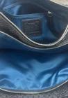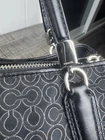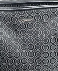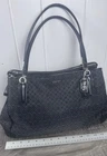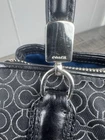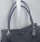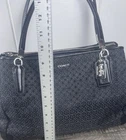 The Coach Madisonop Art Pearlescent Cafe Carryall (F27905) Shoulder Bag is a stylish and elegant handbag designed for women. This black canvas bag features blue handles and hardware accents, with a touch of pearl accents adding a sophisticated touch. The interior is lined and perfect for organizing your essentials. The Coach brand and Madisonop model give this shoulder bag a unique and fashionable appeal, making it a perfect accessory for any outfit.