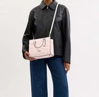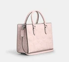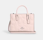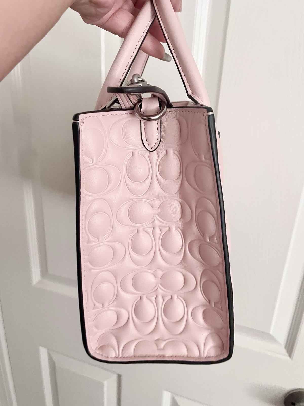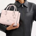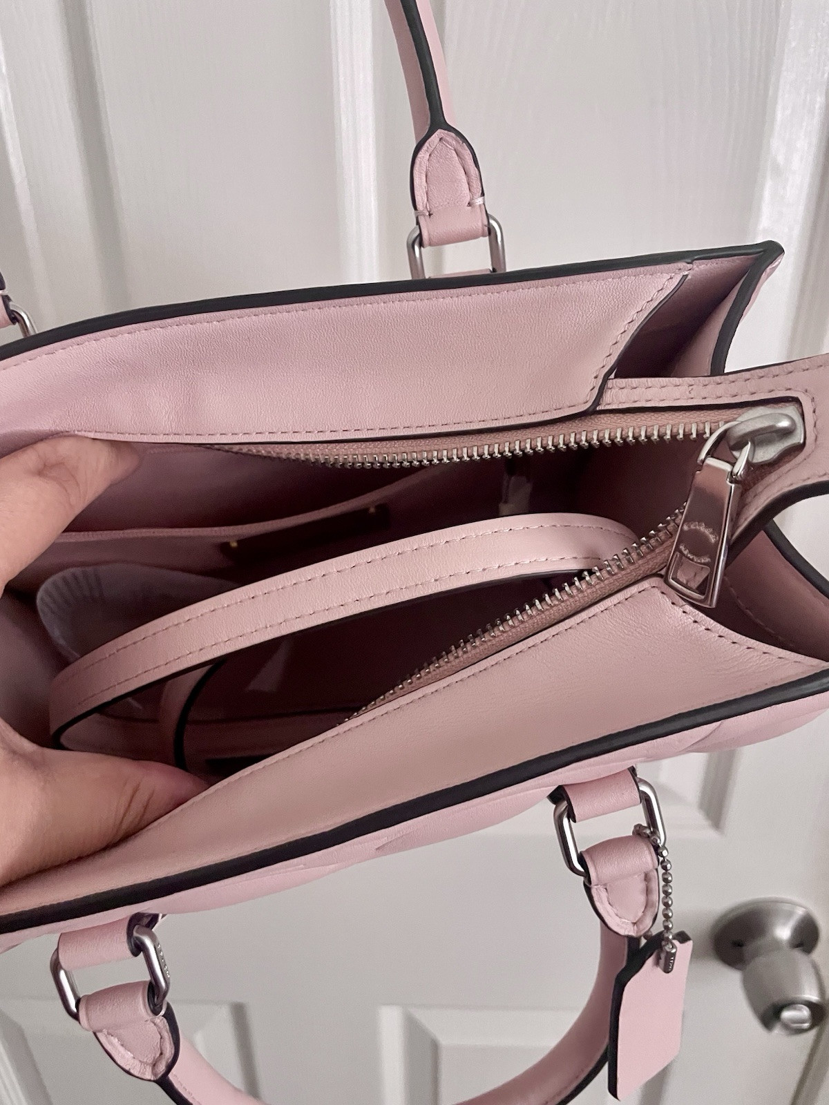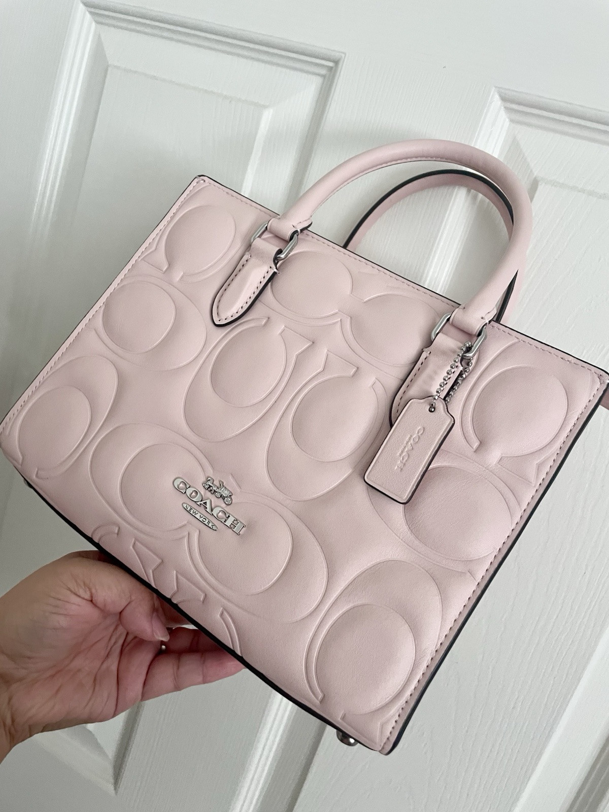 New with tag Coach Maggie Small Tote Bag In Signature Leather CY670 Silver/Blush Style Number CY670 Measurements Length: 9.75" Height: 7.5" Width: 4.5" Materials Signature smooth leather Fabric lining Handle Handles with 3.75" drop Strap Detachable strap with 22.5" drop for shoulder or crossbody wear Features Inside zip and multifunction pockets Zip-top closure Four protective feet at base Price is firm
