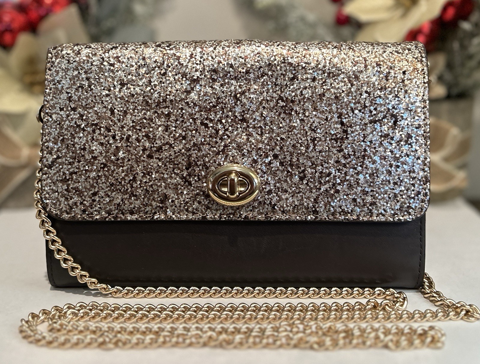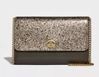 Coach Marlow F38963 gold glitter turn-lock crossbody clutch with gold chain strap. Condition: Excellent preowned condition. Minimal signs of use. Glitter finish is smooth and intact, hardware bright, and interior very clean. Color: gold/platinum (champagne-gold glitter flap with cool dark brown leather body) Material: Leather with coated glitter flap Hardware: Gold tone Features: • Signature Coach turnlock closure • Chain crossbody strap • Interior zip pocket, slip pocket, and card slots • Fully lined interior • Compact yet roomy, fits phone, keys, and small essentials • Can be worn crossbody or as a clutch Approx. Measurements: Width: 8.25” Height: 5” Depth: 1.5” Strap drop: 22” Ships fast from a smoke free home. 10% of the sale supports The Trevor Project.