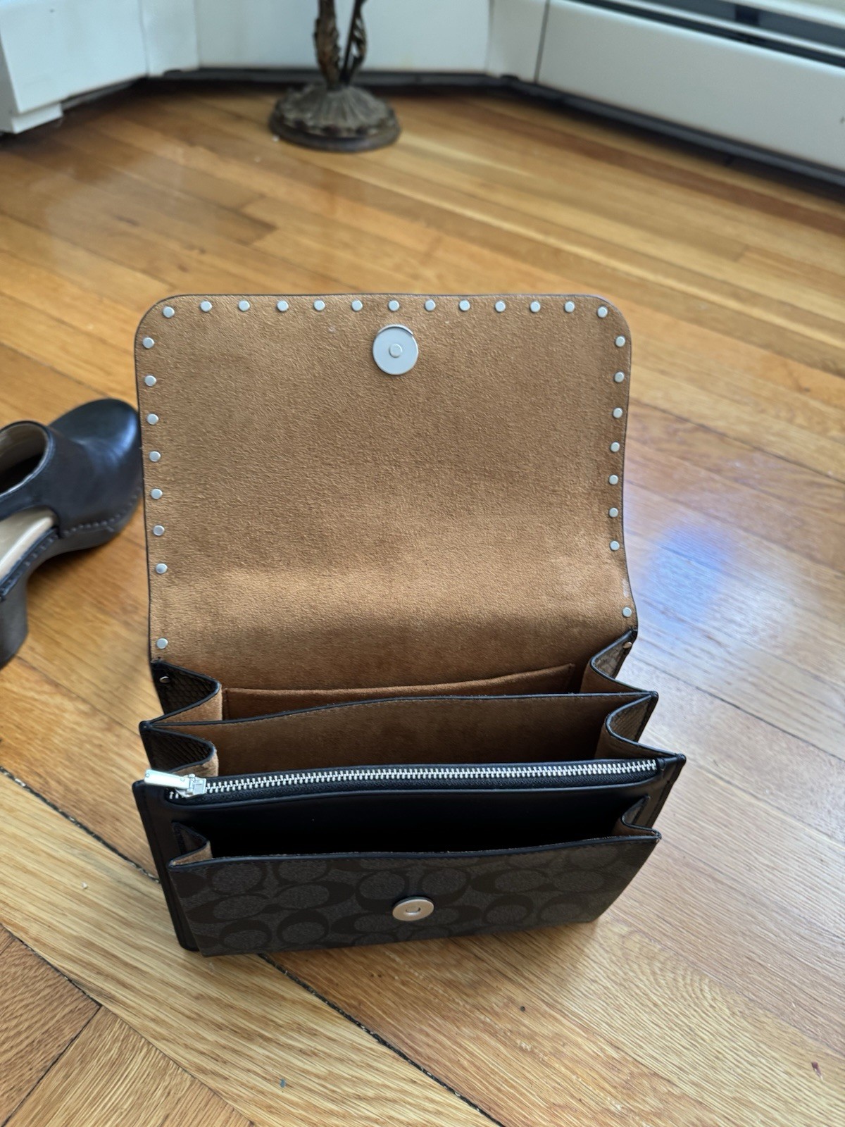 The Coach Medium Leather Crossbody Shoulder Bag in black with silver hardware is a stylish and versatile accessory for women. This rectangular-shaped bag features a solid black exterior made of leather with silver hardware accents. It has a medium size, making it perfect for carrying essentials while on the go. The crossbody strap with a silver handle adds a trendy touch, while the zip and snap closure ensures your belongings are secure. The beige leather lining adds a touch of luxury to this chic and practical purse from Coach.