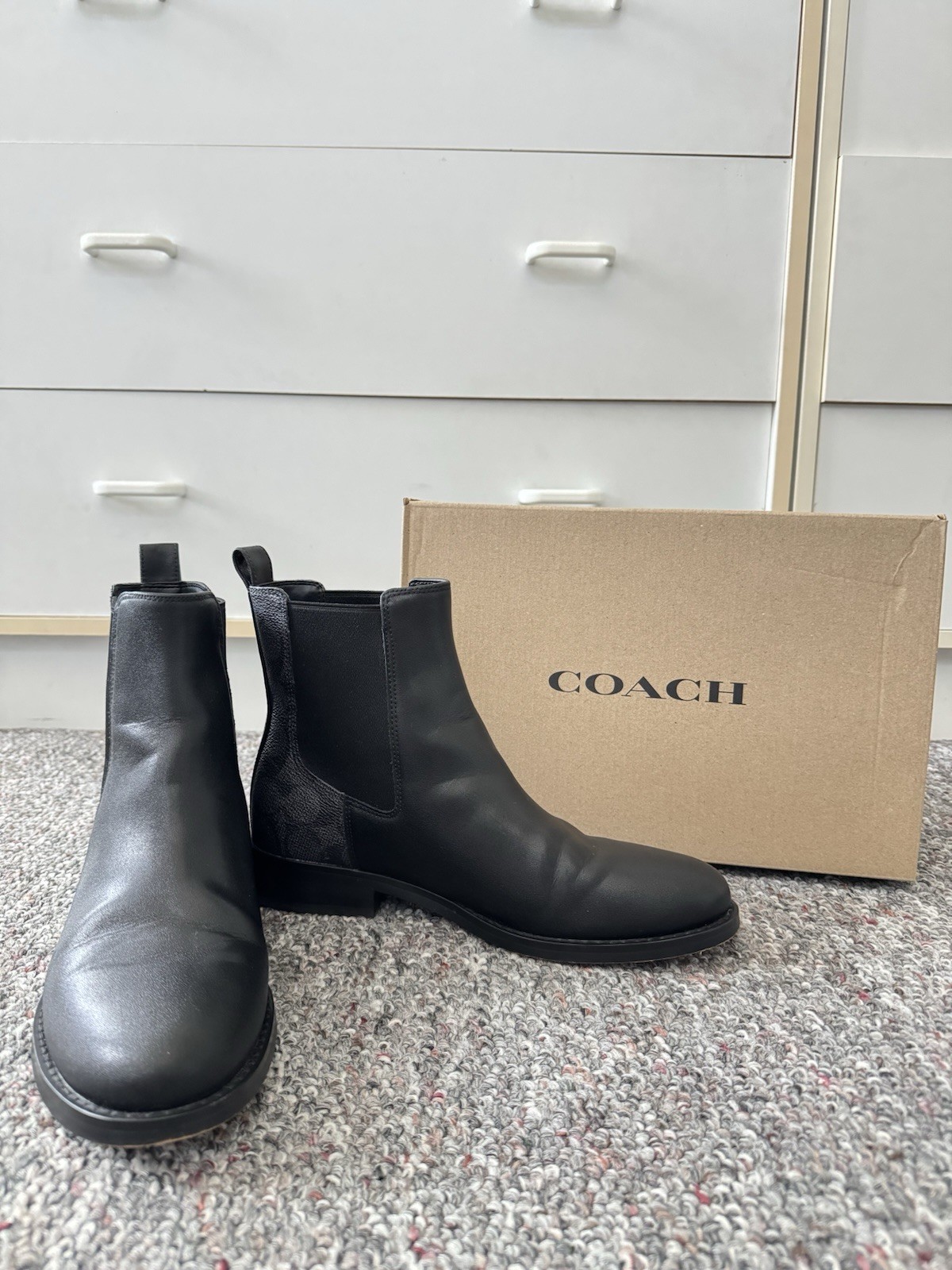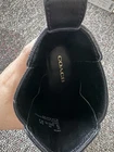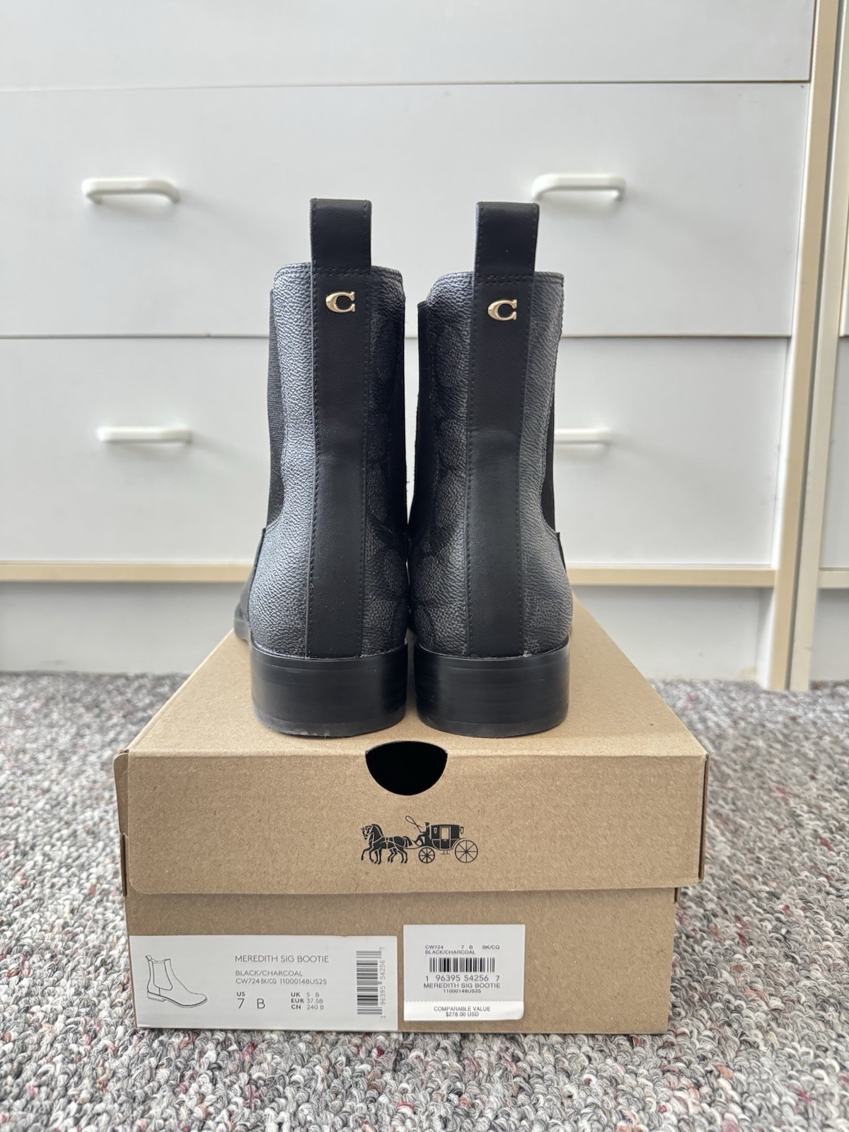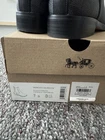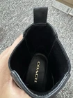 The Coach Meredith Sig Bootie in Black/Charcoal, size 7 US, is a stylish and versatile ankle boot with a low 1-inch heel, perfect for casual occasions during the winter and fall seasons. Made with leather lining and featuring the signature Coach logo accents, this boot offers both comfort and sophistication. The classic design and timeless Coach Signature product line make this boot a must-have for any woman's wardrobe.