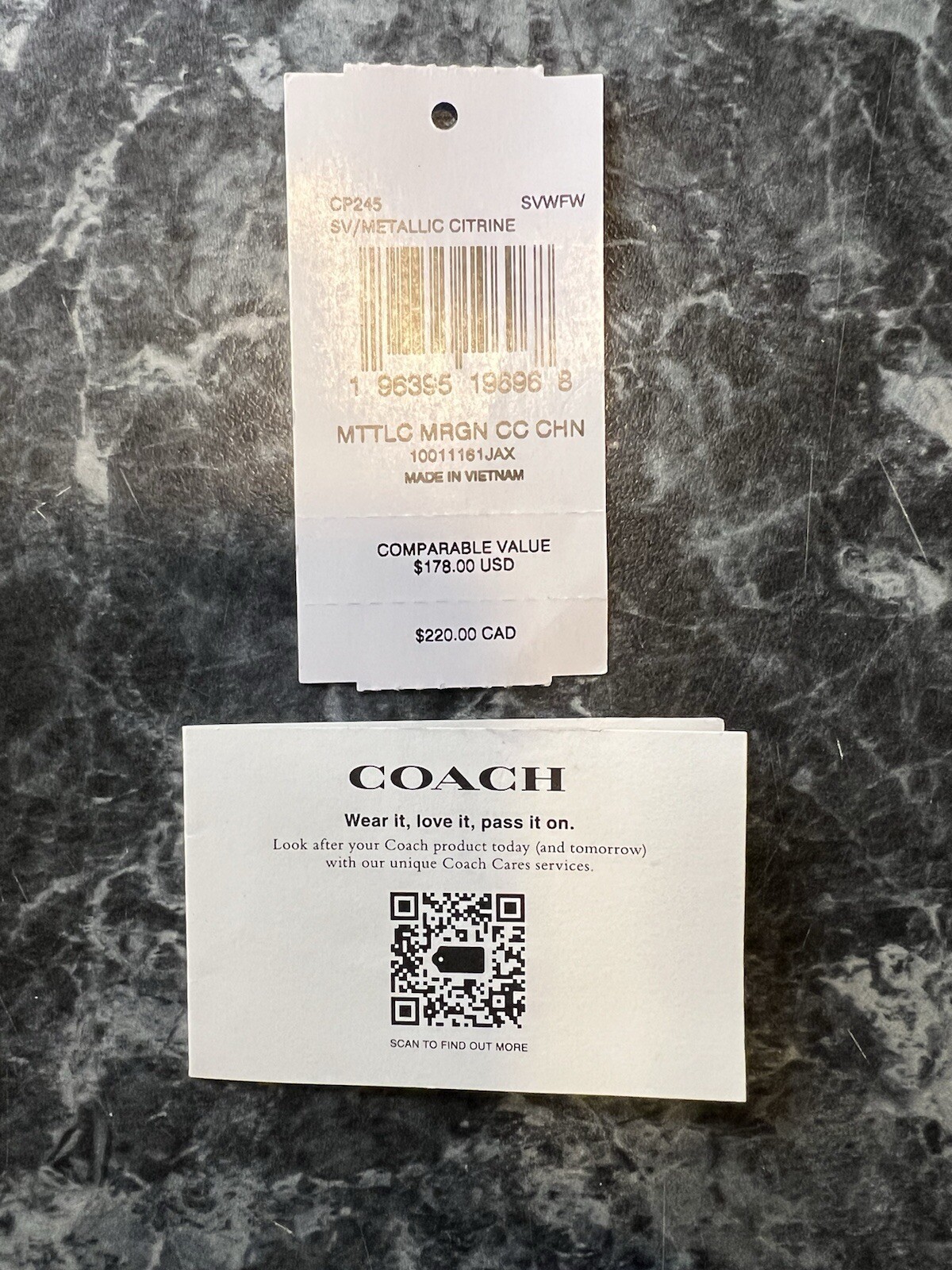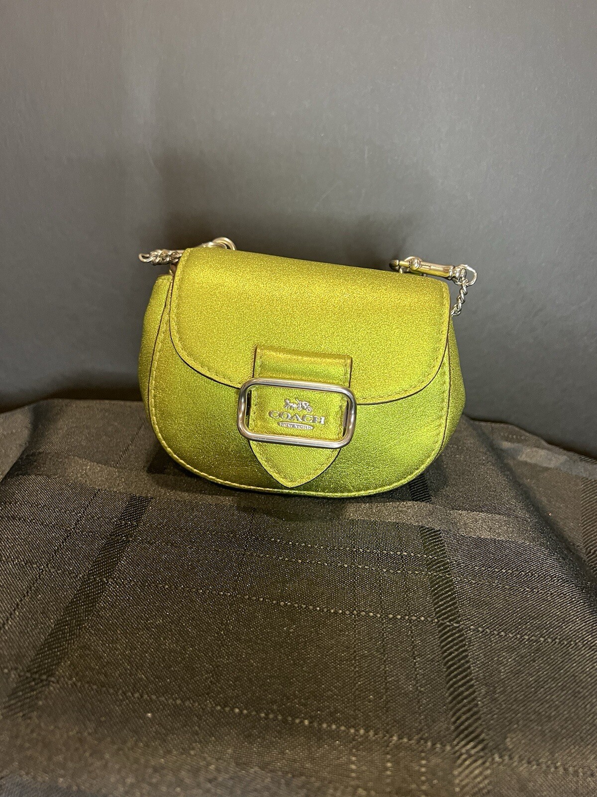 New with tags. Tags are unattached however this item has never been used. Smoke and pet free home. Closet purge many more top quality designer item will be listed. This beautiful Coach Morgan card case is the perfect addition to any wardrobe. With its metallic green leather exterior and silver hardware, it's both stylish and durable. The bag features a magnetic snap closure and a crossbody strap with a drop of 23 inches, making it easy to carry around all day long. The interior is lined in tan and includes inner pockets, credit card slots, and a detachable strap for added convenience. This wallet with chain is perfect for any occasion, whether it's for travel, a wedding, or just a casual day out. The bag width is 5 inches, the bag height is 3 3/4 inches, and the bag depth is 2 1/4 inches. The handle/strap color is silver, and the accents include a strap accent.