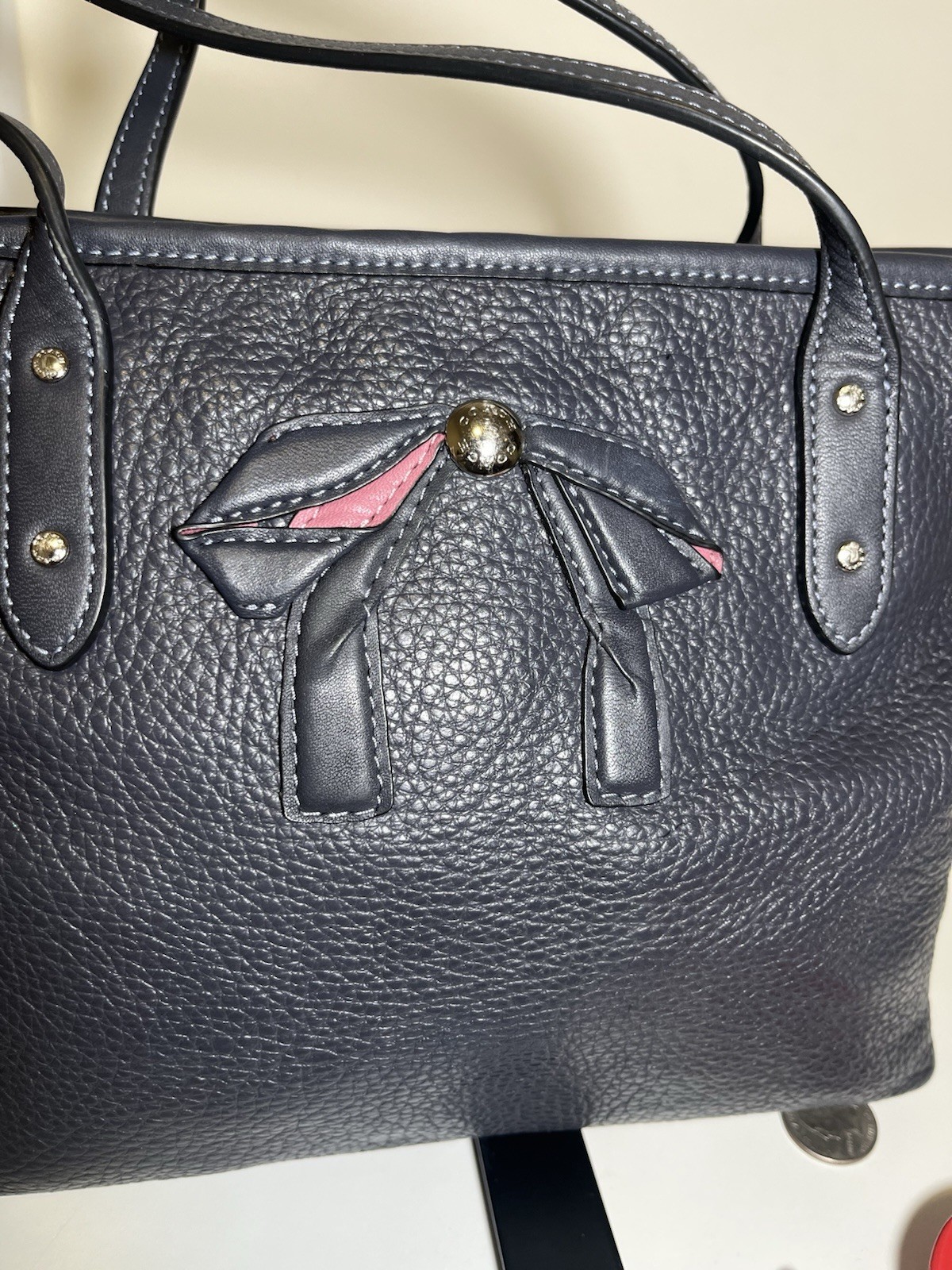 This Coach mini tote is a chic little gem—perfect for daily errands or nights out! The midnight leather looks sleek, and the bow adds a cute touch. Love the zip closure and silver hardware—so practical yet stylish. Shows some wear but still holds up beautifully. A great find for anyone who loves compact, elegant bags!